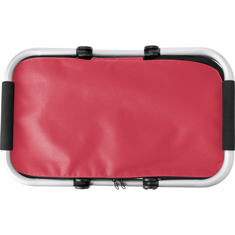 Összehajtható bevásárlókosár alumínium vázzal, hőtartó fóliás béléssel, EVA fogóval, cipzáros záródással. 320 g/m2 oxford anyag.