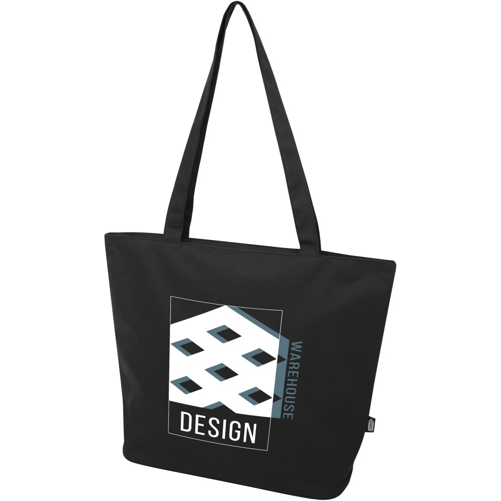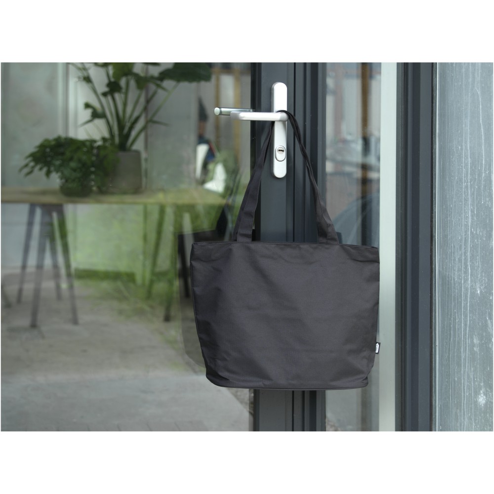 A vízlepergető 600D rPET anyagból készült Panama GRS újrahasznosított cipzáras táska tökéletes és fenntartható választás, ha rendezvényre, strandra vagy bevásárlásra készülsz. Egy cipzáras főrekesszel és egy cipzáras belső zsebbel rendelkezik, amely elég nagy a telefonod vagy más értékes holmi tárolására. Fülei 34 cm hosszúak, ezért a táska könnyen hordozható vállon. Teherbírás: 10 kg. PVC-mentes.