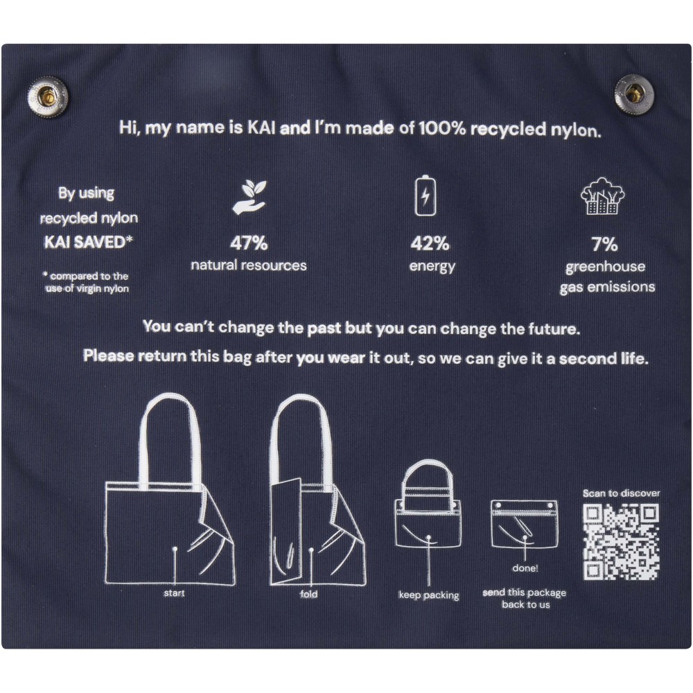 Kai GRS újrahasznosított bevásárlótáska ? a legpozitívabb hatás környezetvédelmi szempontjából. A fenntarthatóság kifejezése a jobb dizájnnal kezdődik ? egy olyan dizájnnal, amely kevesebb hatással van a környezetre. Az egy táskával elért átlagos ártalomcsökkentés a következő: 7% szénlábnyom, 42% energia és 47% ökoköltség. A táska 200T GRS tanúsítvánnyal rendelkező újrahasznosított nejlonból készül, és egy klasszikus és időtálló bevásárlótáska, amely mindennapi használatra alkalmas. Az emblémázásra javasolt pozíció a zseb, amely egyben tok is.