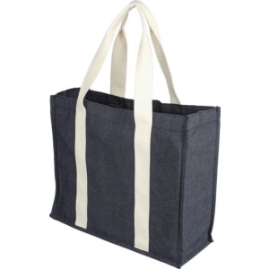 Bevásárlótáska 15 cm-es talpszélességgel és hosszú vászon fogantyúkkal. A farmer anyag 65% poliészterből és 35% pamutból készült. Egy nyomógombbal zárható. A farmer színtartóssága 2-3 szintig terjed. Anyaga: 280 g/m2.