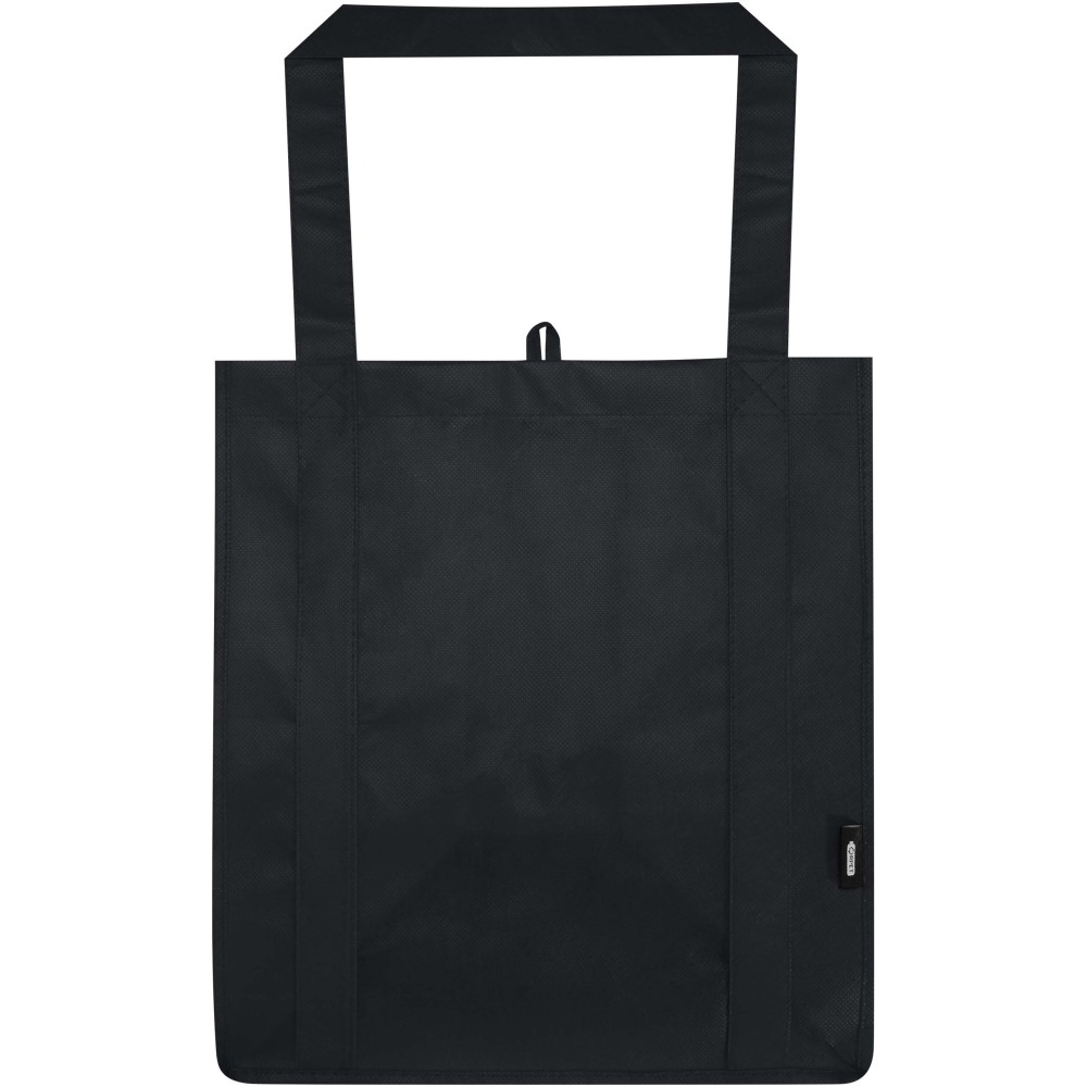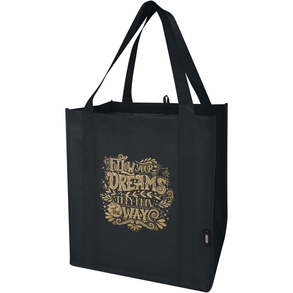 A Liberty GRS tanúsítvánnyal rendelkező újrahasznosított bevásárlótáska tartós és szakadásálló nem szőtt RPET anyagból készült, megerősített aljrésszel, amely extra stabilitást és sokoldalú felhasználást biztosít. A táska nagy méretű főrekesszel és 25 cm hosszú fülekkel rendelkezik, így kényelmesen hordozható. Űrtartalma: 29 liter. Teherbírás: akár 12 kg.