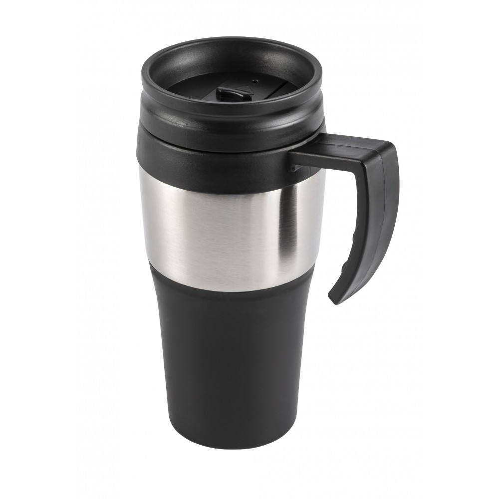 Termoszbögre rozsdamentes acélból és műanyagból. Nem szivárgásmentes. Mosogatógépben nem tisztítható. 500 ml. BPA-mentes műanyag.