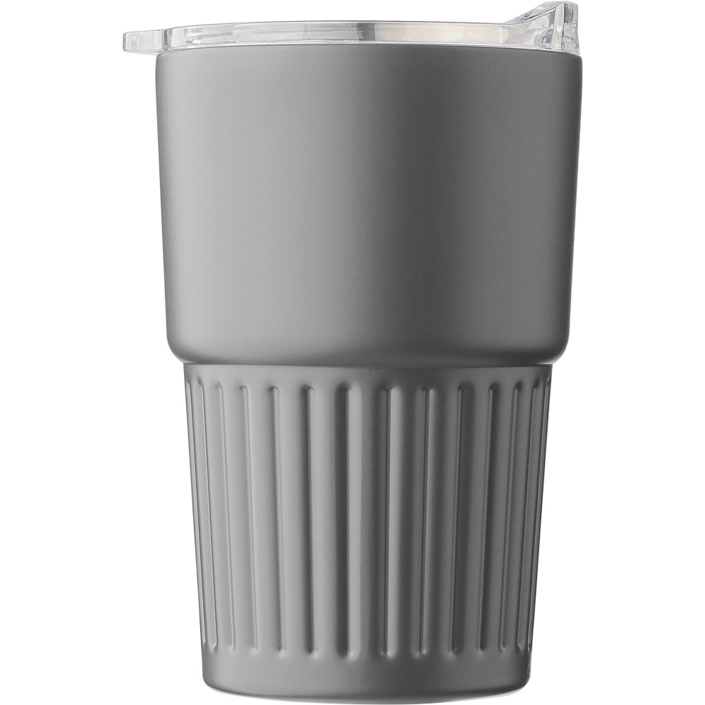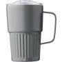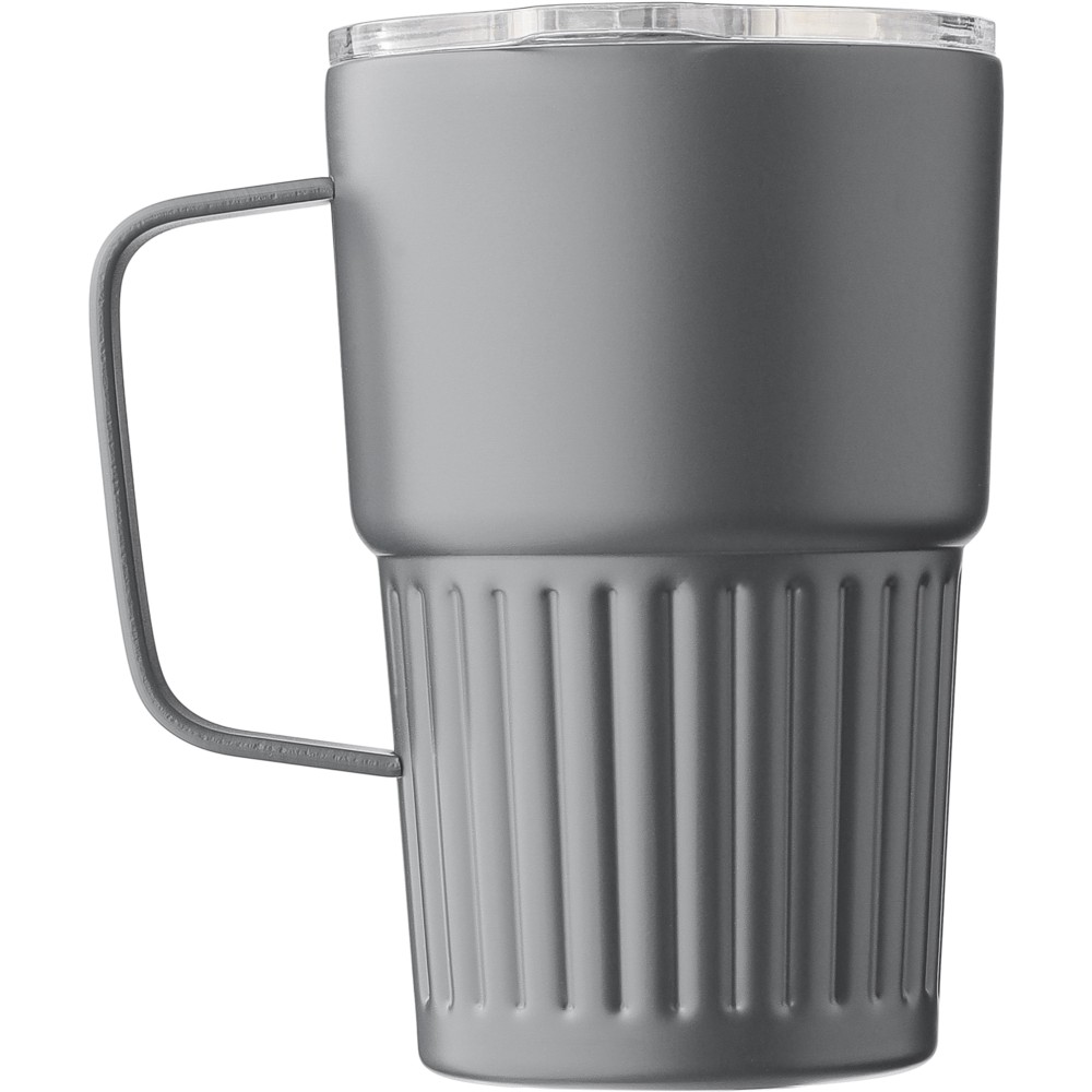 Újrahasznosított rozsdamentes acél útibögre, 450 ml. A belső 304-es, a külső 201-es rozsdamentes acélból készült, bordás markolattal és masszív fogantyúval, műanyag, csúszózáras fedéllel. Gravírozott újrahasznosított logó található a bögrén. Csomagolása barna papírdoboz.