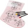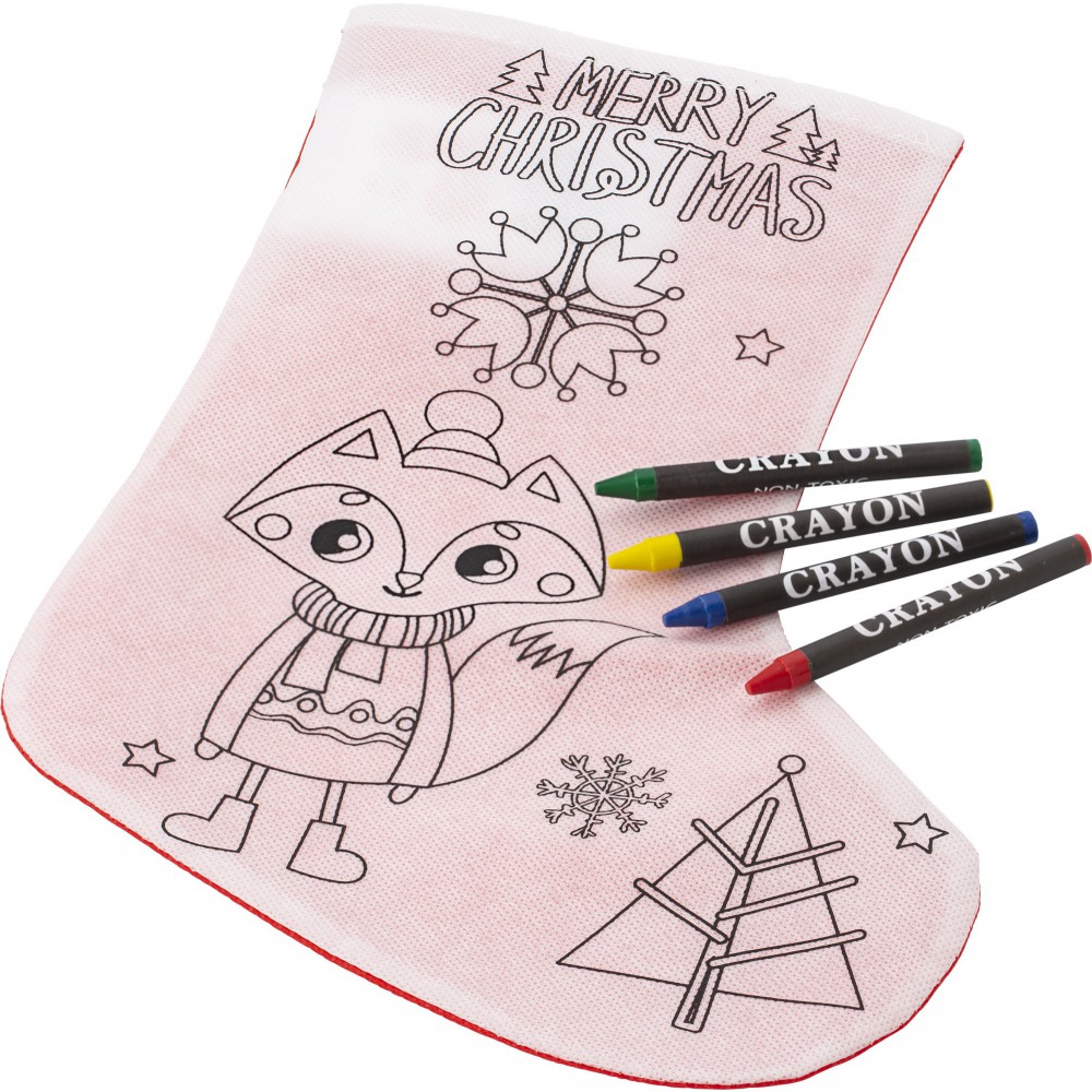 Színezhető mikuláscsizma 4 db zsírkrétával (zöld, piros, sárga, kék színben). Egyik oldala piros, a másikon előre nyomtatott, színezhető mintával. Nemszőtt anyag, 80 g/m2.