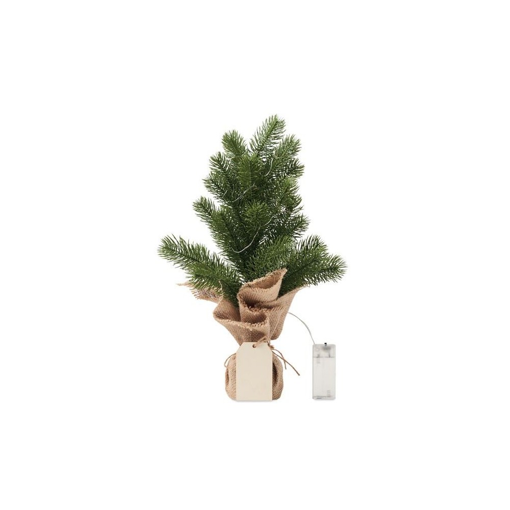 Mini mű (PE) karácsonyfa 20 LED-es meleg sárga fényfüzérrel, juta alapon. Fából készült ajándékkísérő címkével. 2 db AA elemmel működik, elem nélkül szállítjuk.