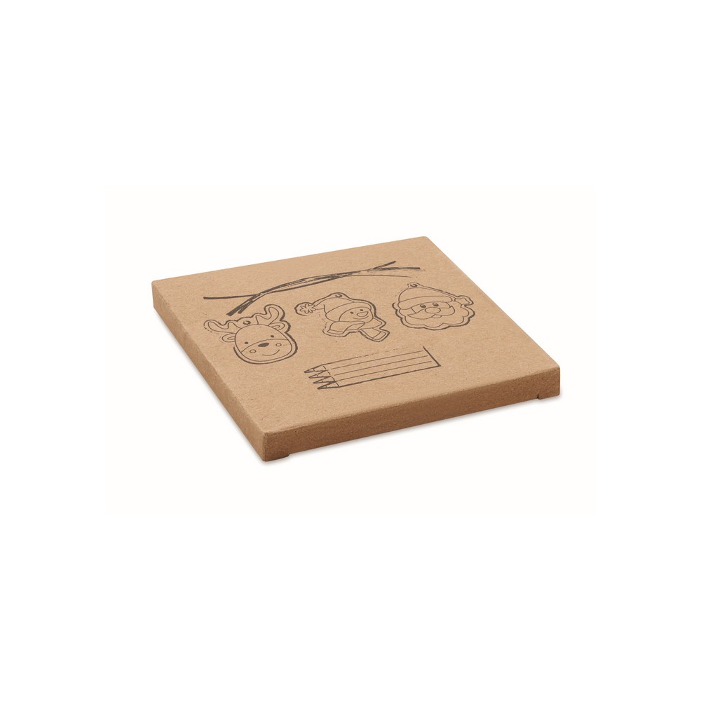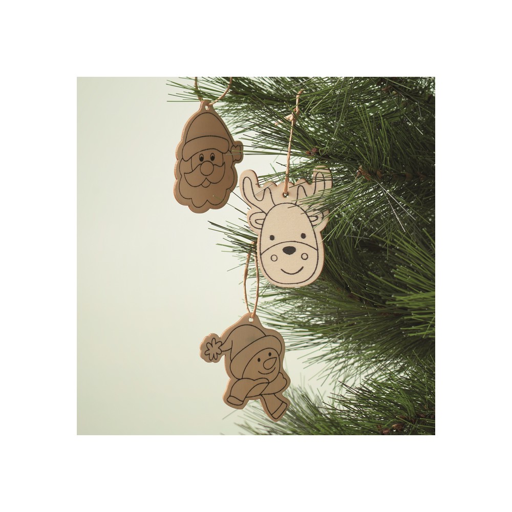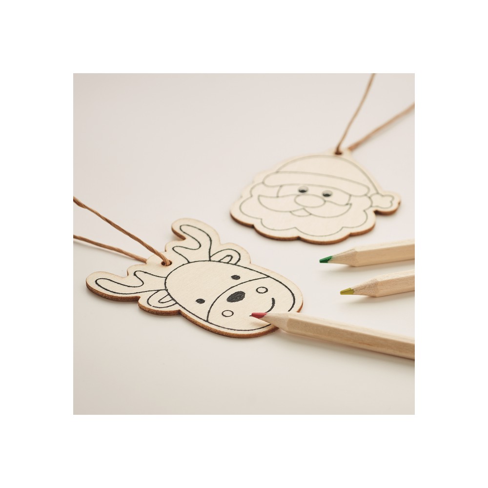 3 darab fából készült, kiszínezhető karácsonyfadíszből álló készlet, 4 színes ceruzával. Kraftpapír dobozban. A fa természetes anyag, termékenként szín- és méretbeli eltérések jelentkezhetnek, ami befolyásolhatja a dekoráció végső eredményét.