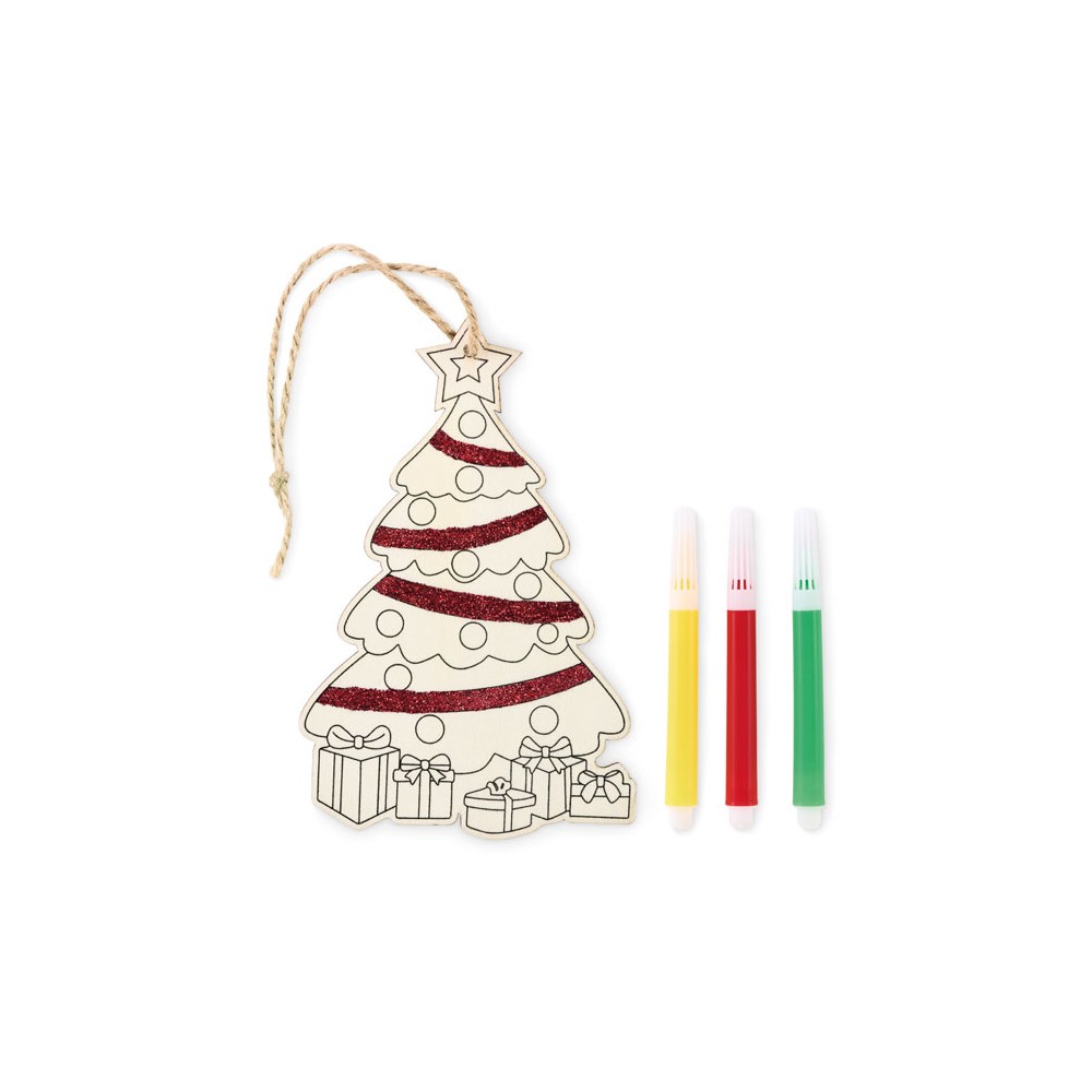 Nyárfából készült, kiszínezhető karácsonyfadísz 3 filctollal, juta zsinórral.