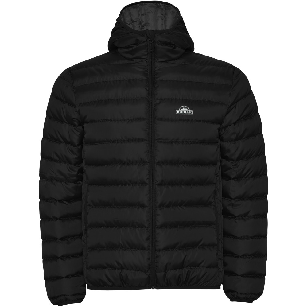 Pehely tapintású férfi steppelt dzseki kapucnival, tasakkal. Fordított cipzárakkal, hozzá illő állvédővel. Két cipzáras elülső zseb. Gumis kézelő, a alj- és a kapucniszegély. Kontrasztos belső bélés. Könnyű és összehajtható ruhadarab. Vízálló. Szélálló modell. 100% poliészter, 290 g/m2. Bélés: 100% poliészter. Töltet: 100% poliészter.