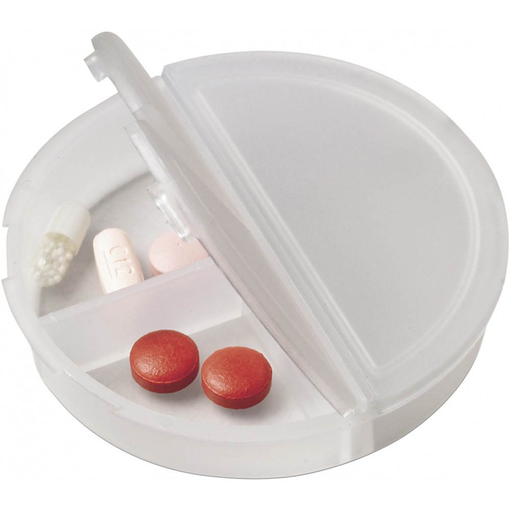Kerek gyógyszertartó doboz 3 rekesszel. Átlátszó BPA-mentes műanyag.