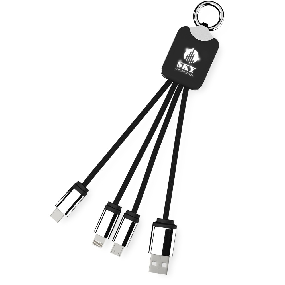 Világító logós töltőkábel gumi és fém bevonattal, három csatlakozóval (Type-C, Android, iPhone). Egyszerre akár három készülék is tölthető. Kábelek hossza (dugókkal együtt): 10 cm. Az újrahasznosított PET műanyag kábel és csomagolás újrahasznosított papírból és újrahasznosított műanyagból készül.