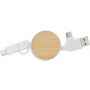 ABS hosszabbítható töltőkábel bambusz elemekkel. USB-C-vel, Lightning-gel és USB-A-val. Egyenként, barna kartontasakba csomagolva.