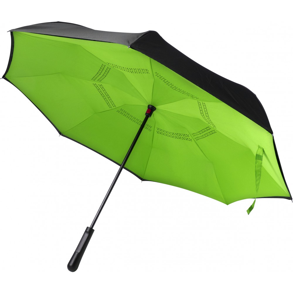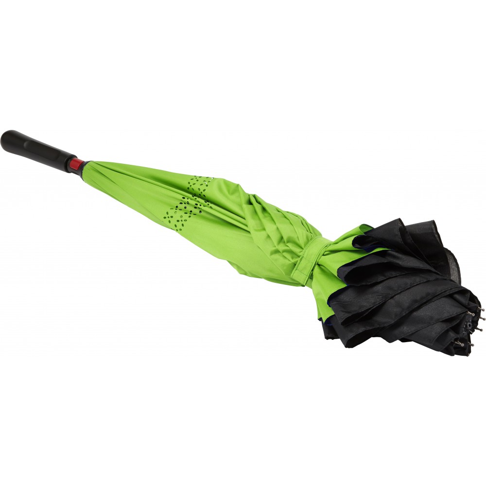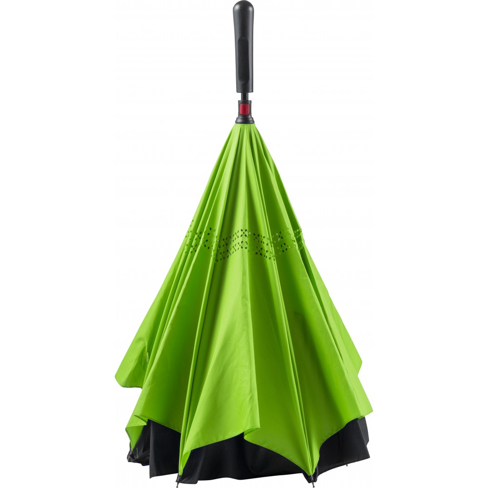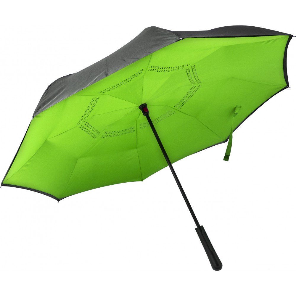 Innovatív, kiforduló szerkezetű, duplafalú esernyő, üvegszálas vázzal és műanyag fogóval. Tépőzáras.