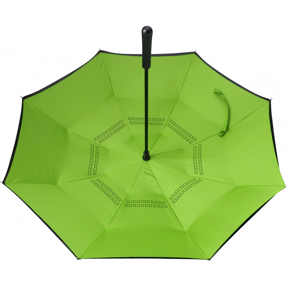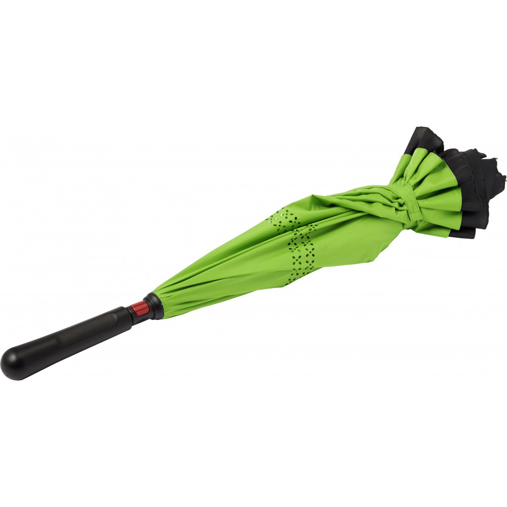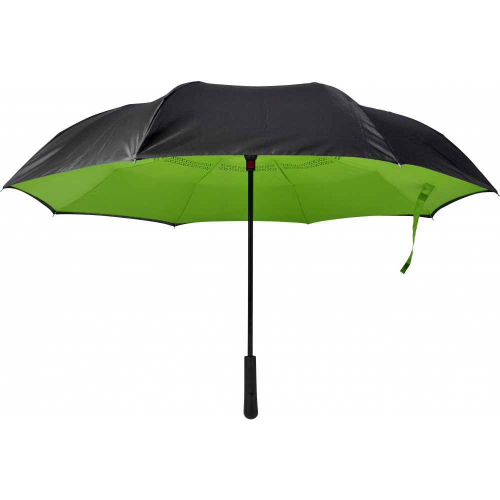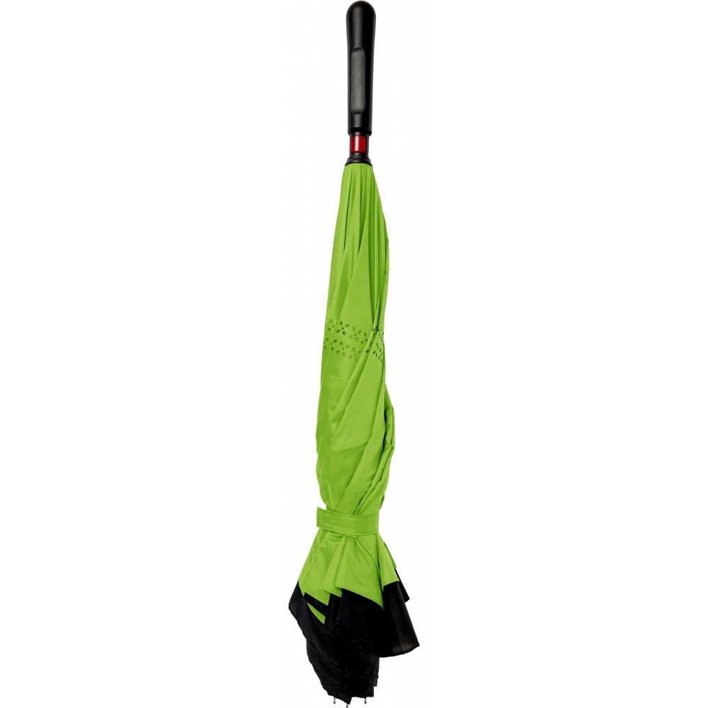 Innovatív, kiforduló szerkezetű, duplafalú esernyő, üvegszálas vázzal és műanyag fogóval. Tépőzáras.
