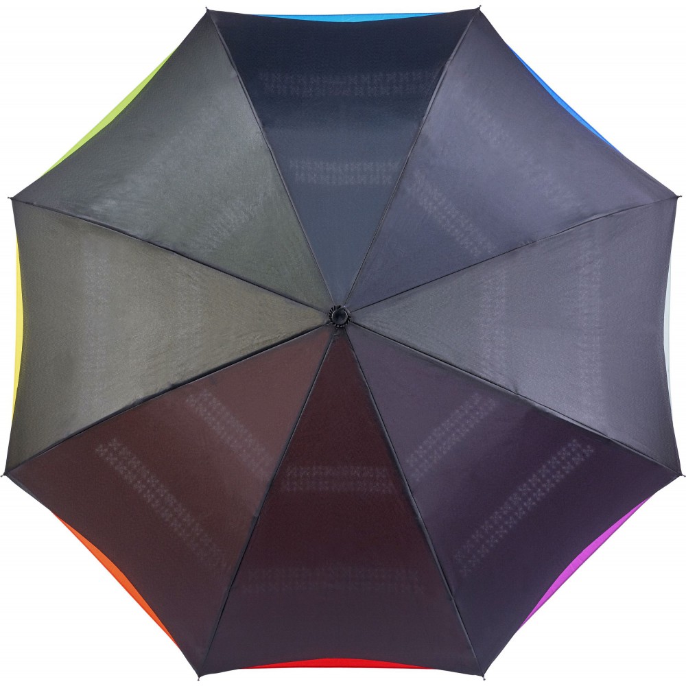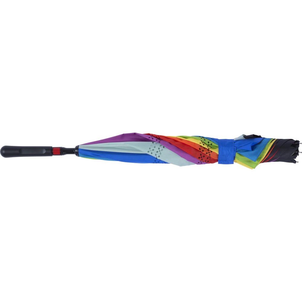 Kifordítható automata esernyő nyolc panellel, fém vázzal, üvegszálas bordázattal, műanyag nyéllel, kétrétegű ernyővel: fekete felső és színes belső vászon. 190T, üvegszál, PVC, vas.