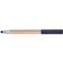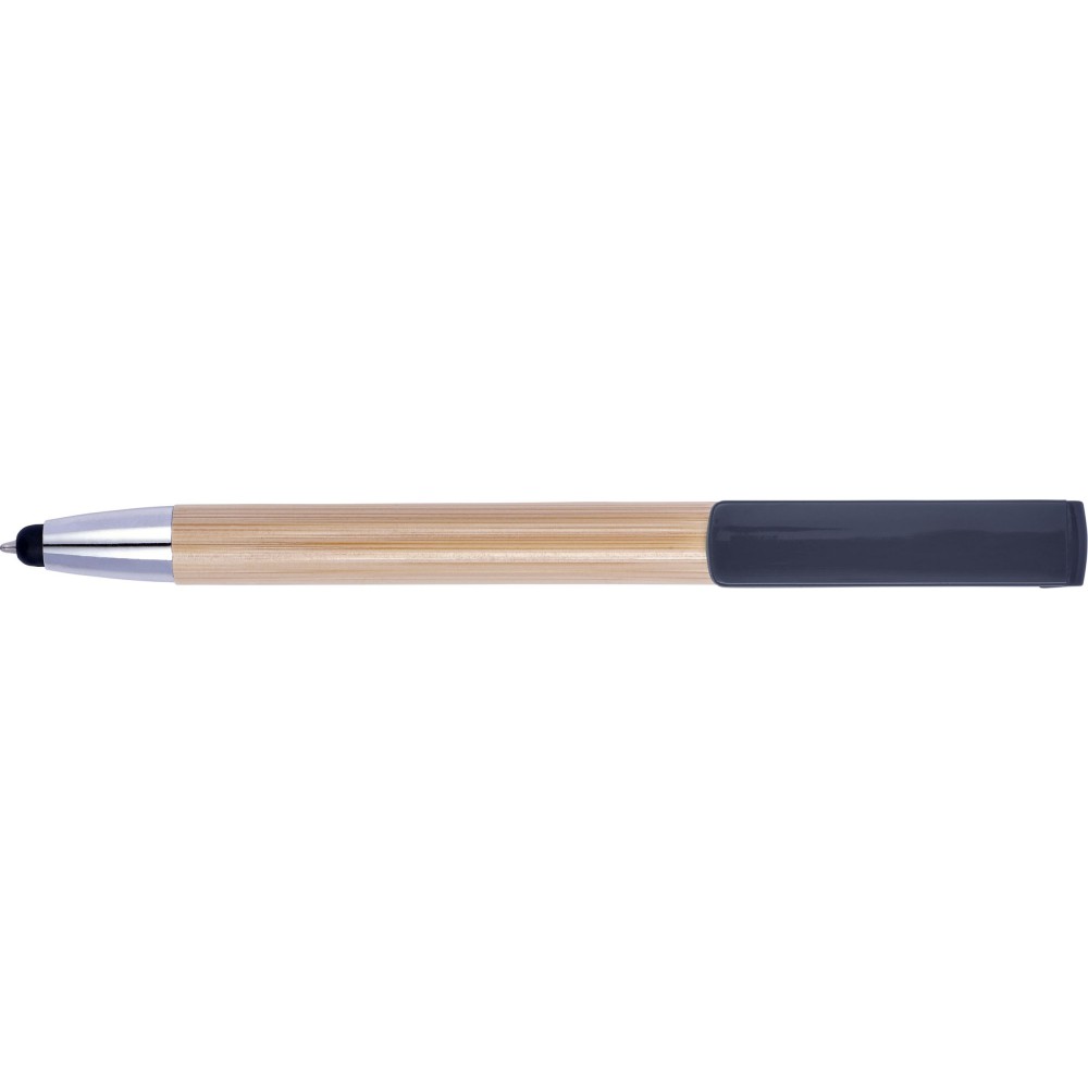 Golyóstoll és érintő kék tollbetéttel, műanyag klipsszel és nyomógombbal. A klipsz nyomógombként funkcionál, és okostelefon-állványként is használható. ABS, bambusz.