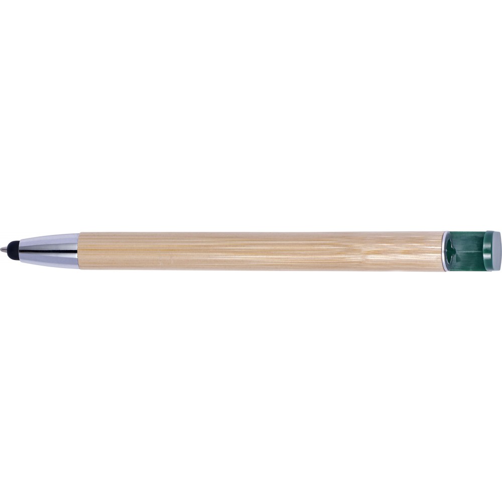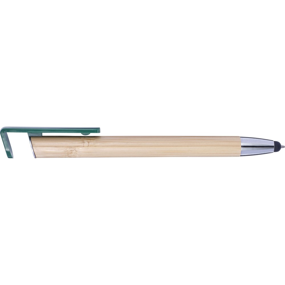 Golyóstoll és érintő kék tollbetéttel, műanyag klipsszel és nyomógombbal. A klipsz nyomógombként funkcionál, és okostelefon-állványként is használható. ABS, bambusz.