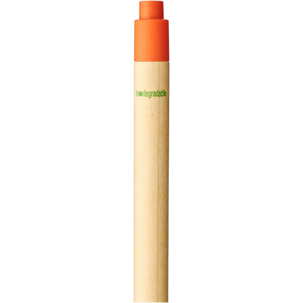 Környezetbarát golyóstoll fekete tollbetéttel, nyomógombos mechanizmussal, biológiailag lebomló papíranyagból készült tolltest és kukorica műanyag kiegészítők. Az újrahasznosított kartondoboz színe nem egységes.