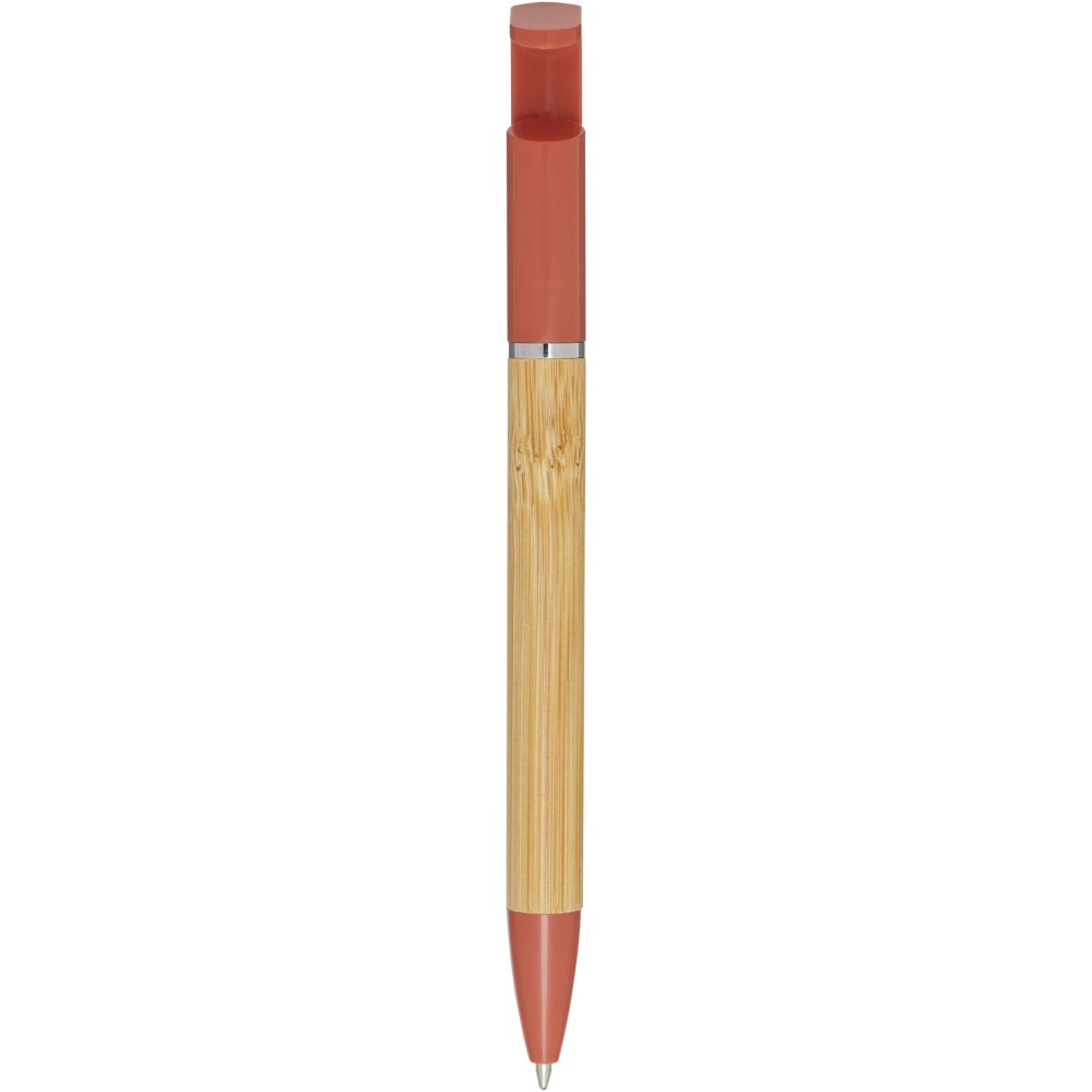 Bambusz golyóstoll, amely telefontartóként is funkcionál. A gomb és a középső gyűrű újrahasznosított műanyagból, a hegy rézből, a tollteste pedig felelősen beszerzett bambuszból készült. Fekete tollbetéttel. Írási hossz: 1000 méter. Tollhegy mérete: 1,0 mm.