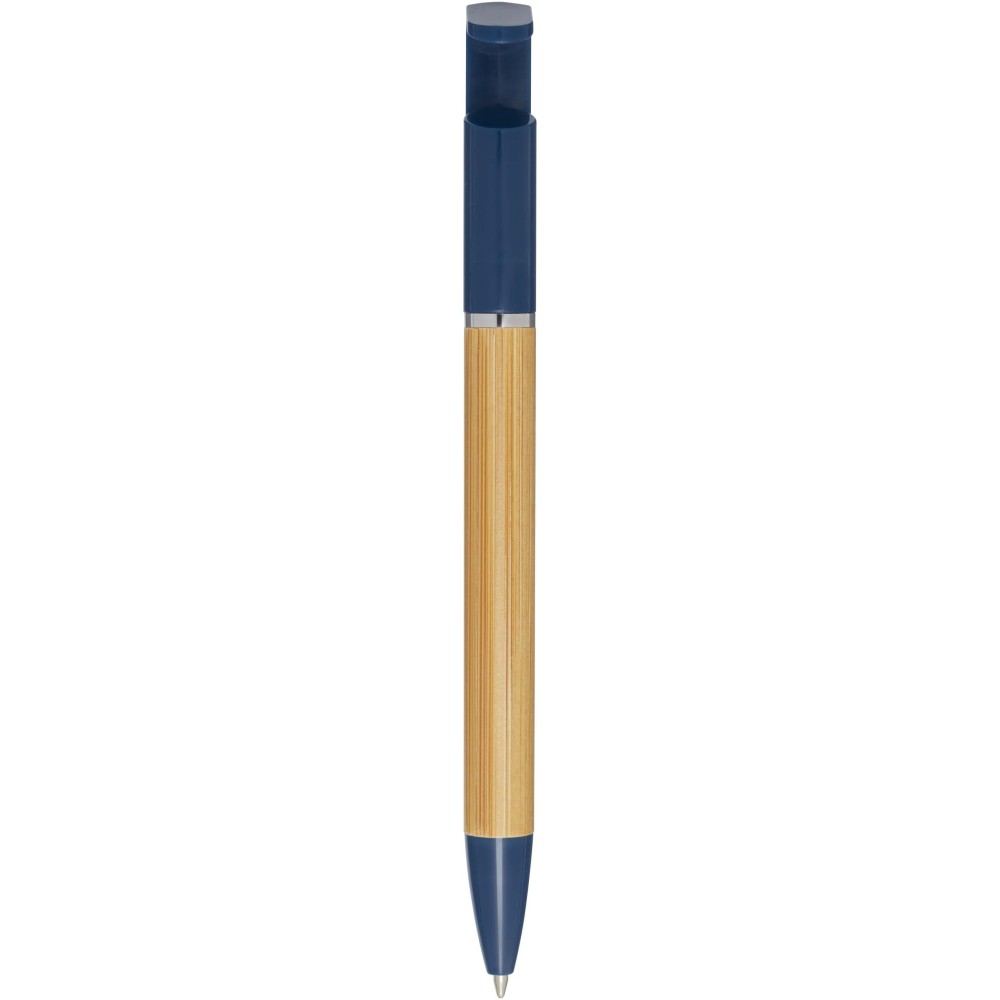 Bambusz golyóstoll, amely telefontartóként is funkcionál. A gomb és a középső gyűrű újrahasznosított műanyagból, a hegy rézből, a tollteste pedig felelősen beszerzett bambuszból készült. Fekete tollbetéttel. Írási hossz: 1000 méter. Tollhegy mérete: 1,0 mm.