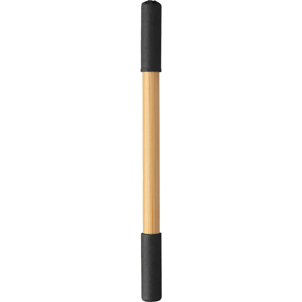 Bambusz végtelenített ceruza és golyóstoll. Az egyik oldalon végtelenített ceruza, a másikon golyóstoll, mindkettő színes karton kupakkal. Kék tollbetéttel.