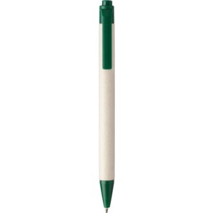 Újrahasznosított tejes kartonból készült golyóstoll újrahasznosított ABS műanyag részekkel. Újrahasznosított ABS logó és újrahasznosított tejes karton logó jelzi a felhasznált anyagok milyenségét. Kék tollbetéttel.