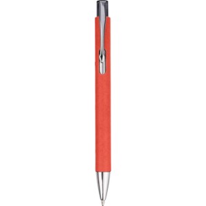 Újrahasznosított kartonból készült golyóstoll krómozott részletekkel. Műanyag tollhegy és nyomógomb, fém klipsz. Kb. 800 méter íráshossz. Fekete tollbetéttel.