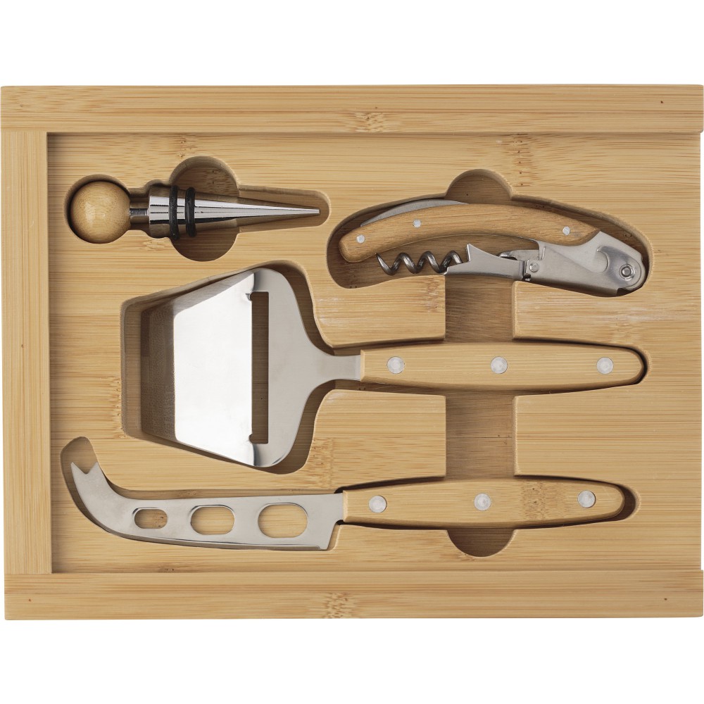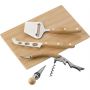 Bambusz sajtos- és boroskészlet. Tartalma: dugóhúzó, bordugó, sajtreszelő és kés.