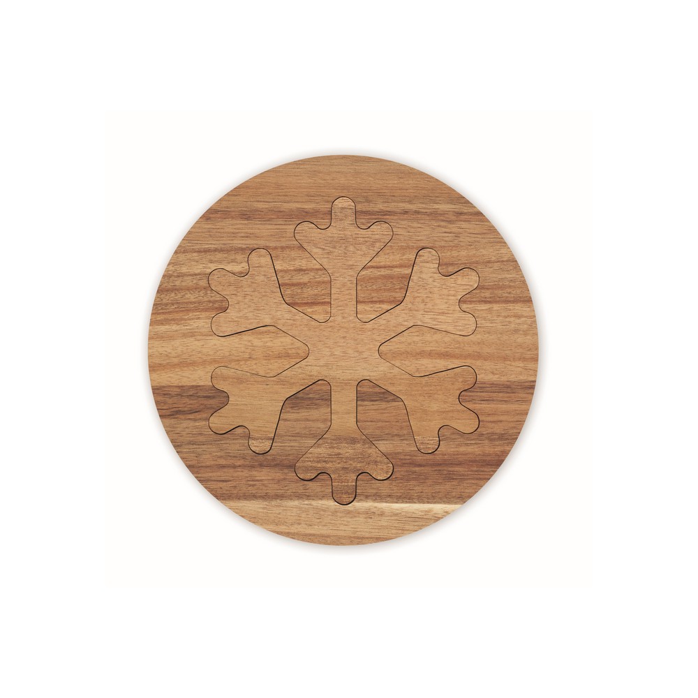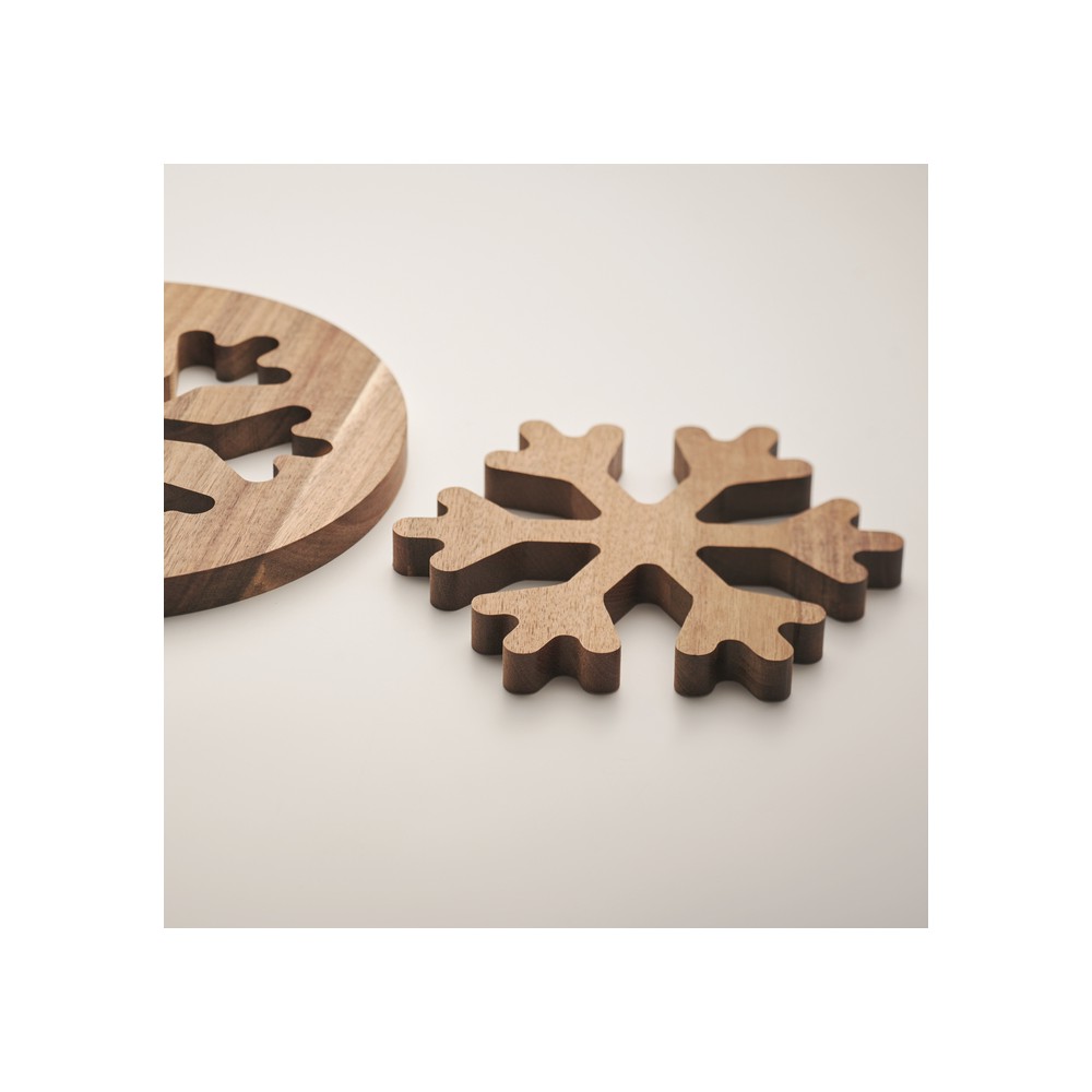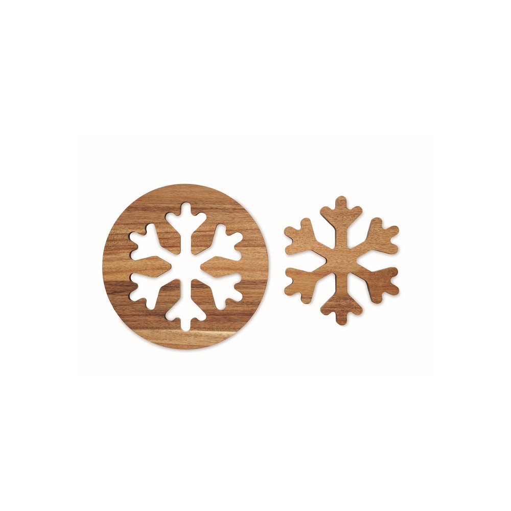 2 darab akáciafa edényalátétből álló készlet hópehely mintával. A fa természetes anyag, termékenként szín- és méretbeli eltérések jelentkezhetnek, ami befolyásolhatja a dekoráció végső eredményét.