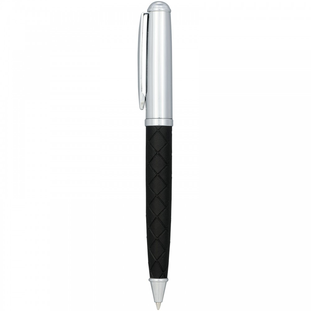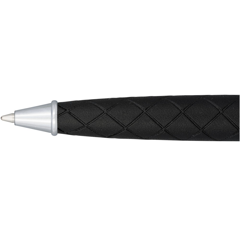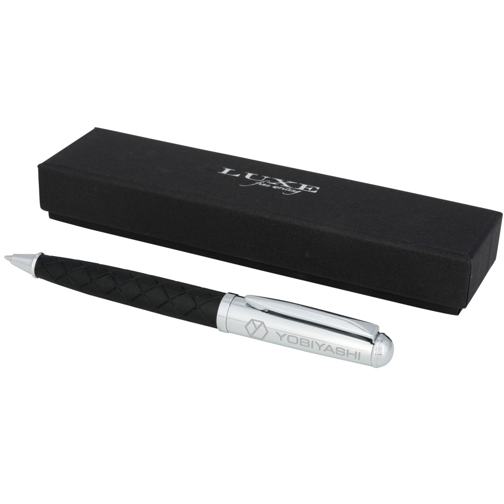 Gömbölyded golyóstoll, alsó része bőr mintázatú dekorációval lett ellátva. Prémium minőségű fekete tollbetéttel. Csomagolása Luxe ajándékdoboz. Fém és műbőr.