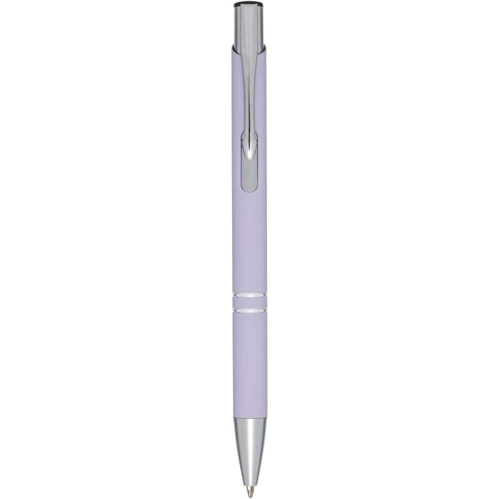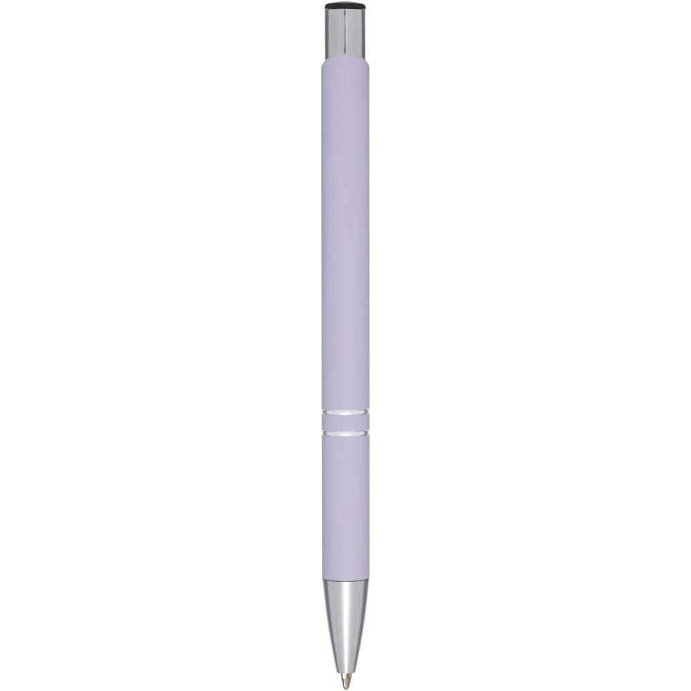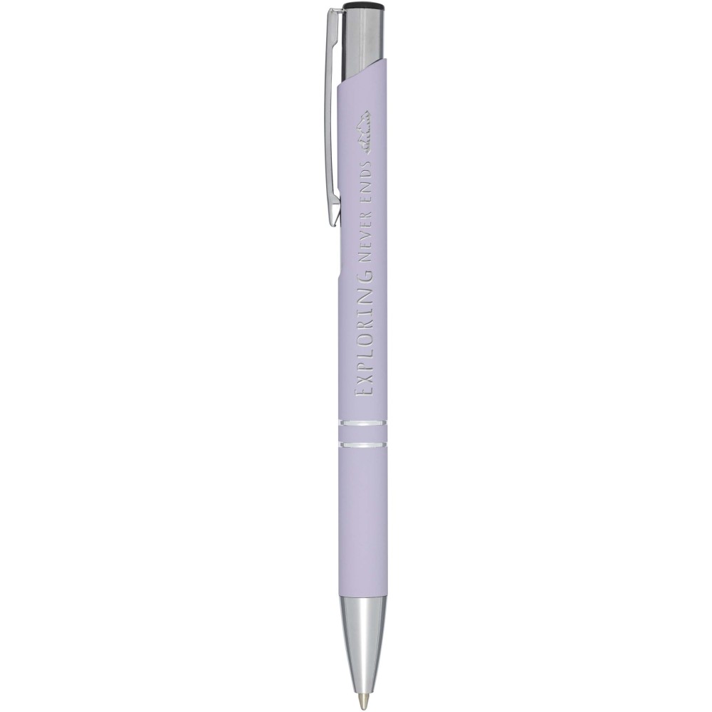 Nyomógombos golyóstoll puha tapintású bevonattal. Lézergravírozáskor megjelenik a toll fényes króm, felület alatti rétege. Fekete tollbetéttel.