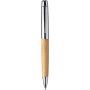 Rozsdamentes acél golyóstoll csavaros mechanikával, bambusz markolattal. Kék színű, fém Parker tollbetéttel. Barna kartondobozba egyedileg csomagolva érkezik.