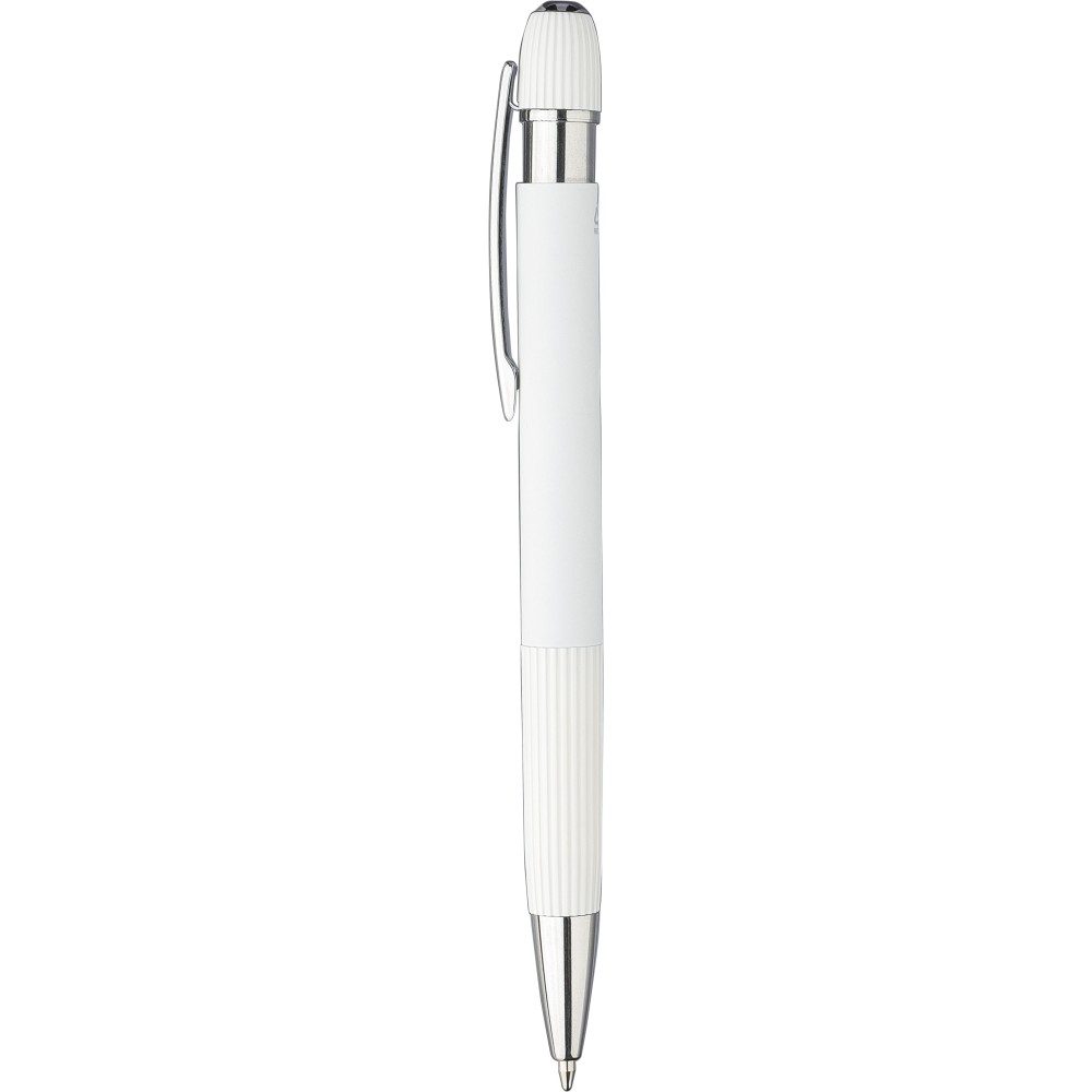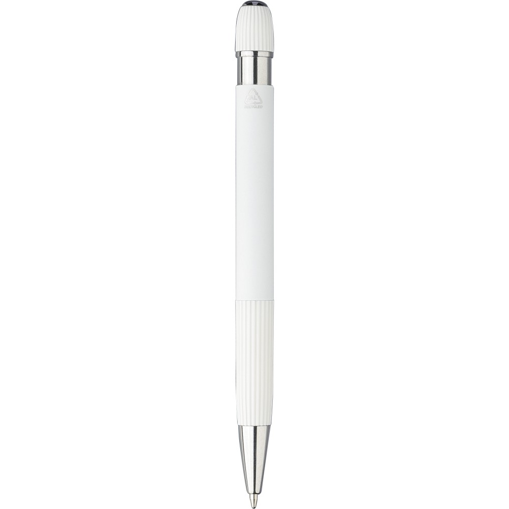 Újrahasznosított alumínium golyóstoll gumírozott felülettel. Csíkos részletekkel a markolaton és a tetején, krómozott műanyag heggyel és fém klipsszel ellátott nyomógombbal. Lézergravírozott újrahasznosított logóval. Kék tintával.