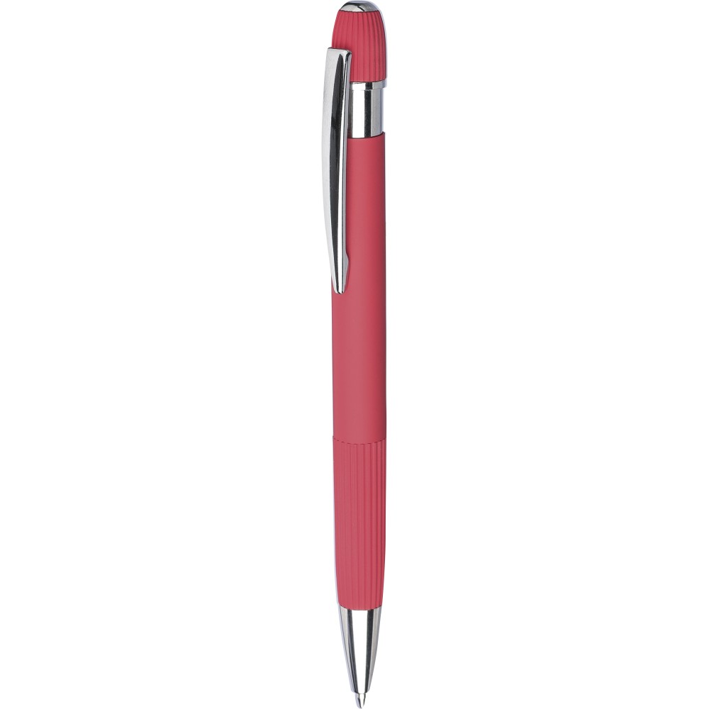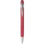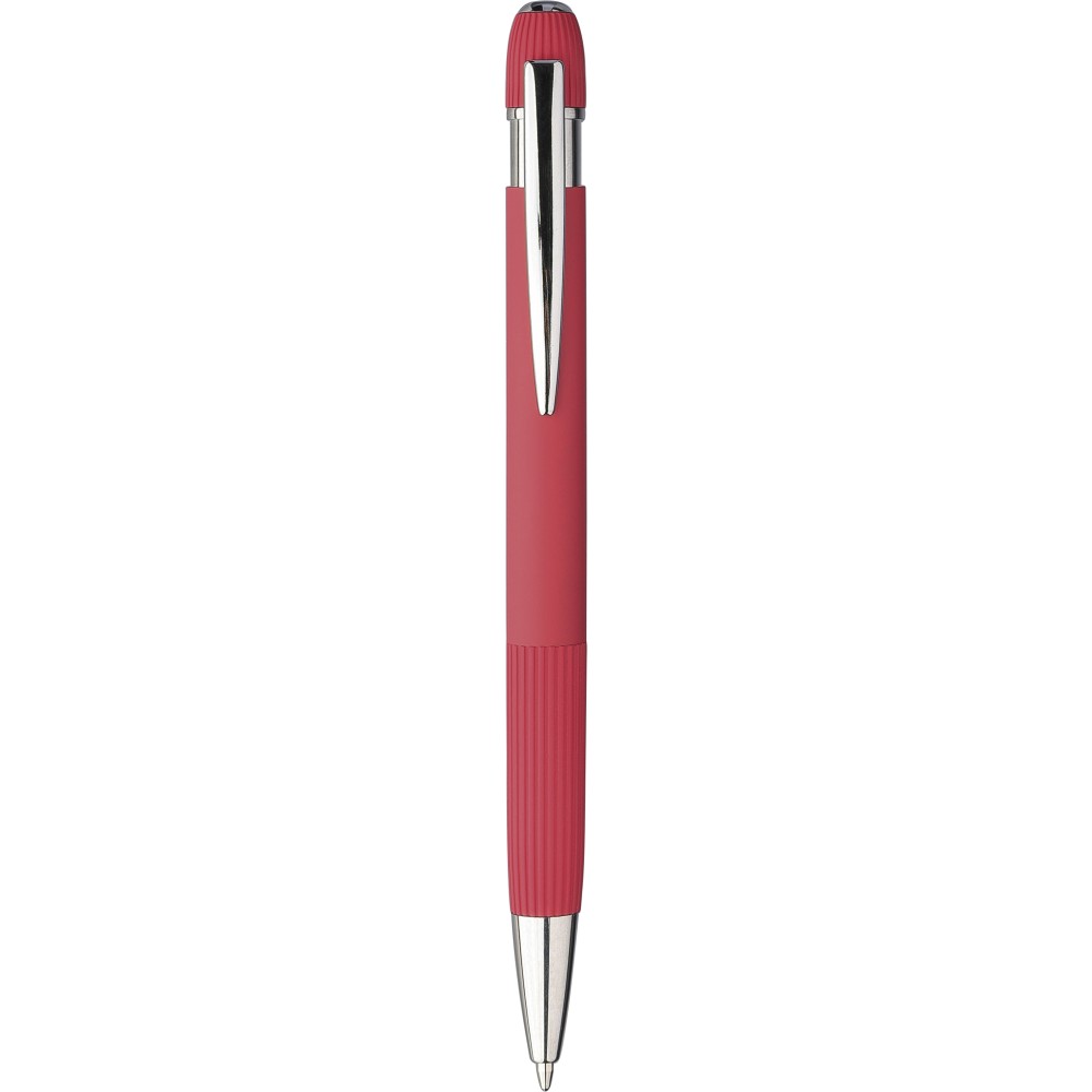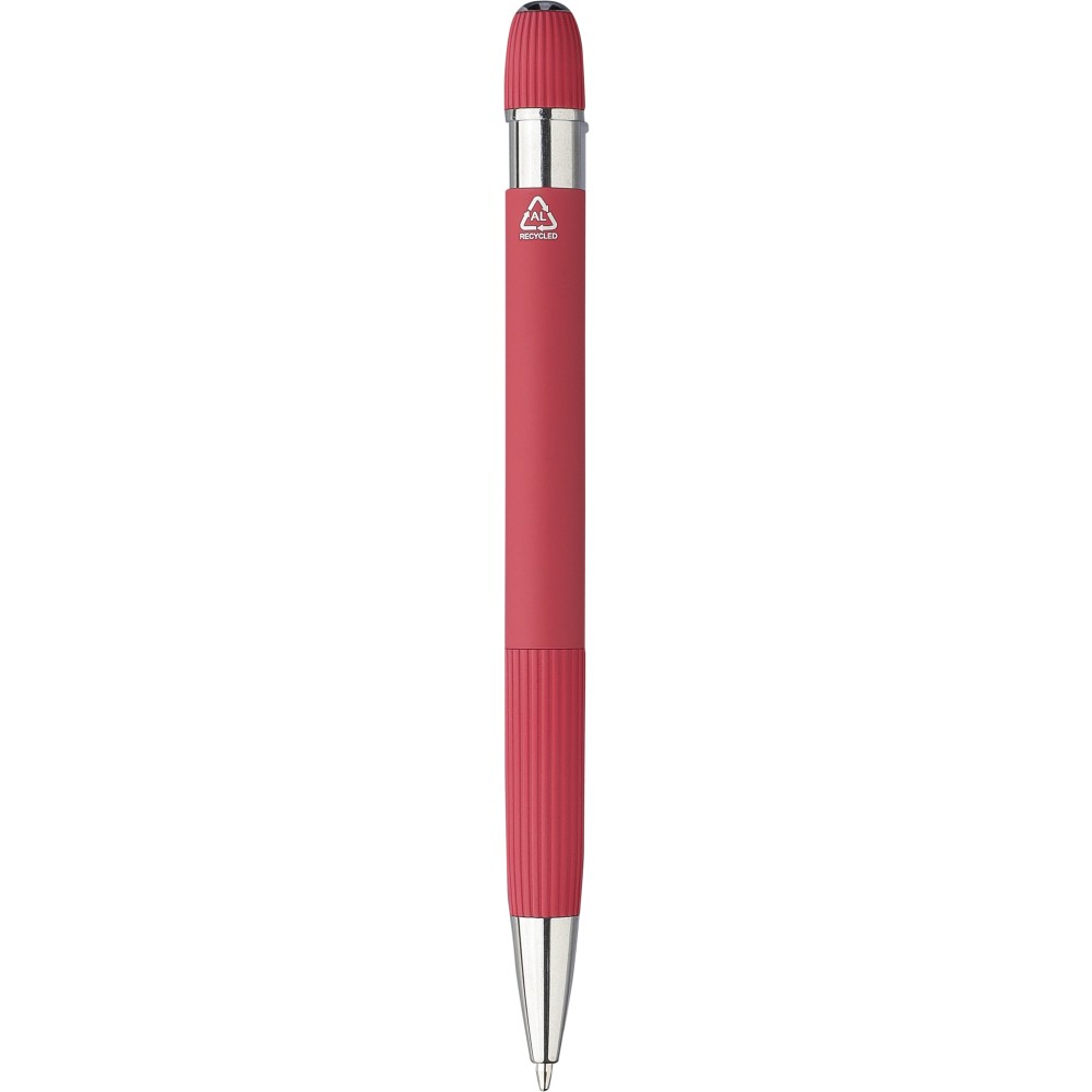 Újrahasznosított alumínium golyóstoll gumírozott felülettel. Csíkos részletekkel a markolaton és a tetején, krómozott műanyag heggyel és fém klipsszel ellátott nyomógombbal. Lézergravírozott újrahasznosított logóval. Kék tintával.