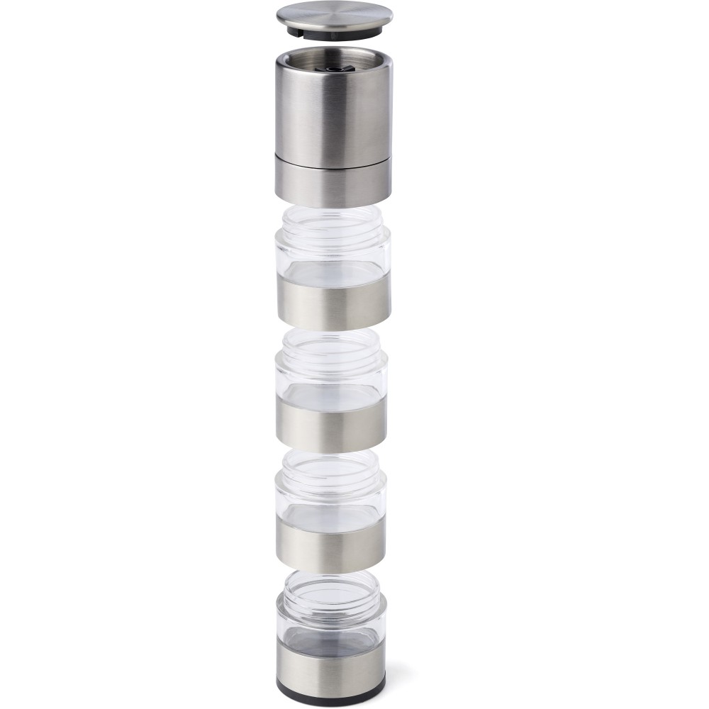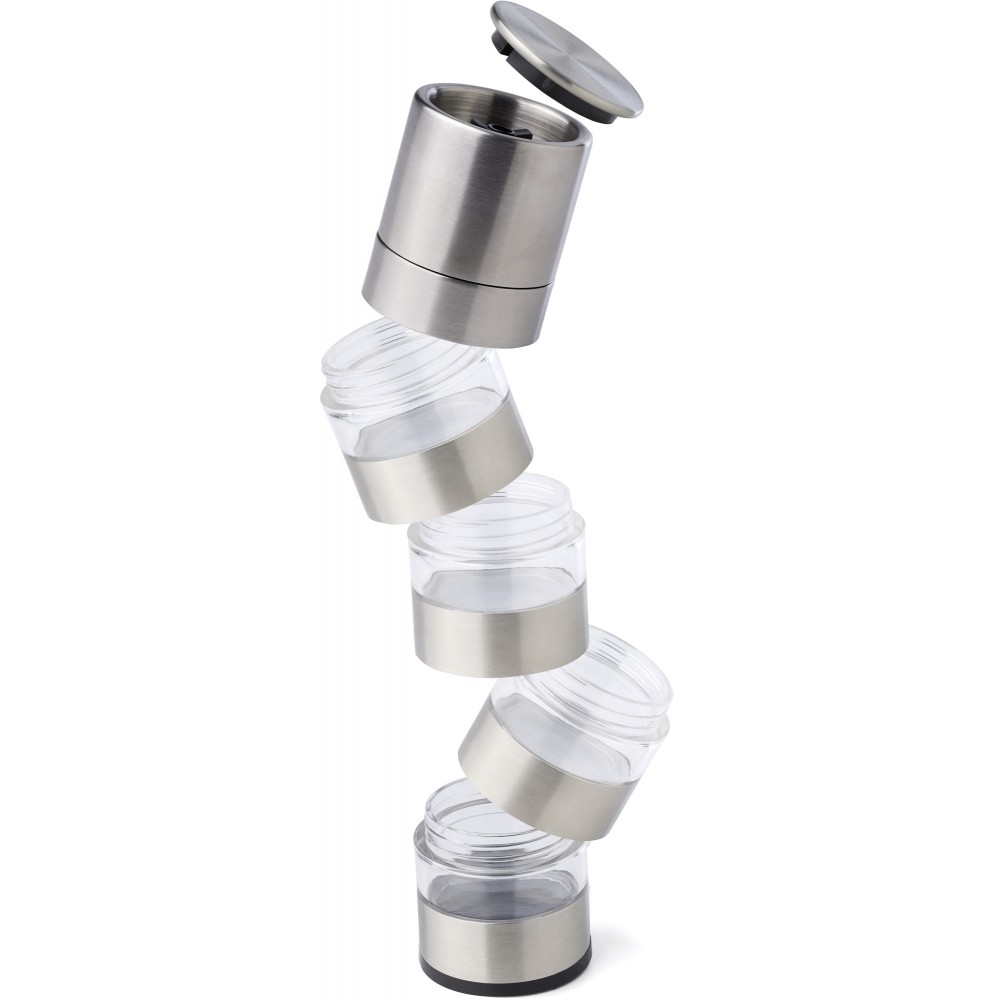 Rozsdamentes acél fűszerdaráló 4 résszel és kerámia őrlővel. Egyenként csomagolva, barna kartondobozban.