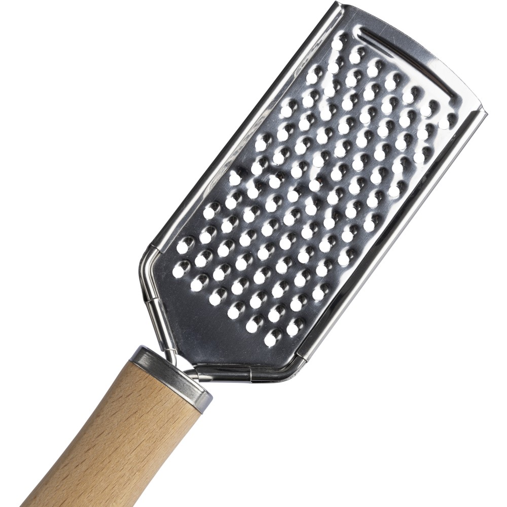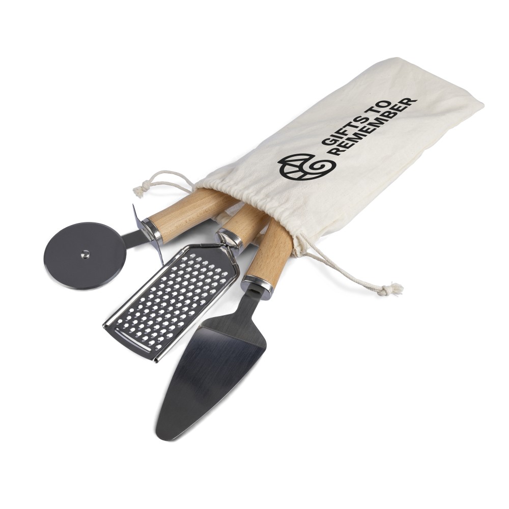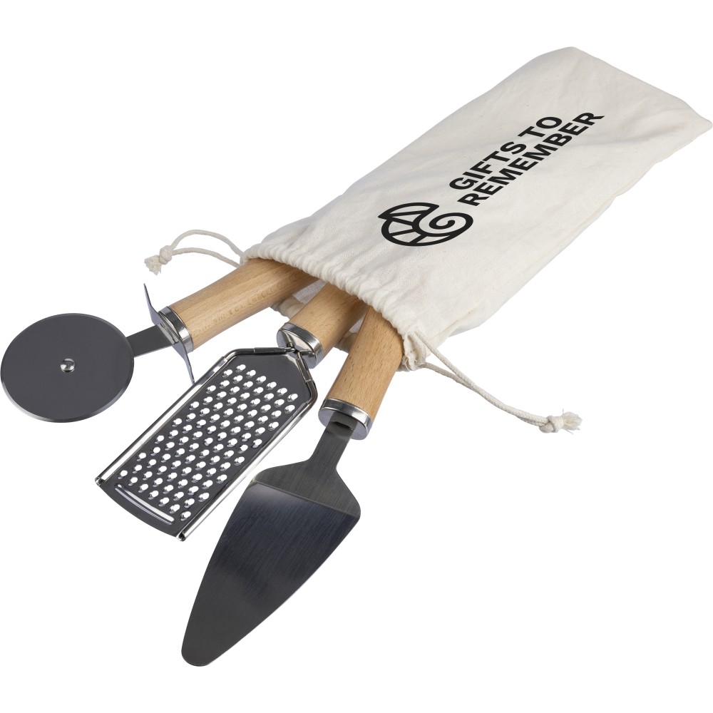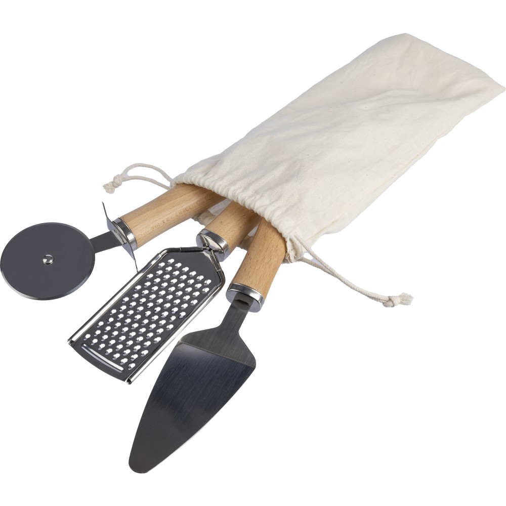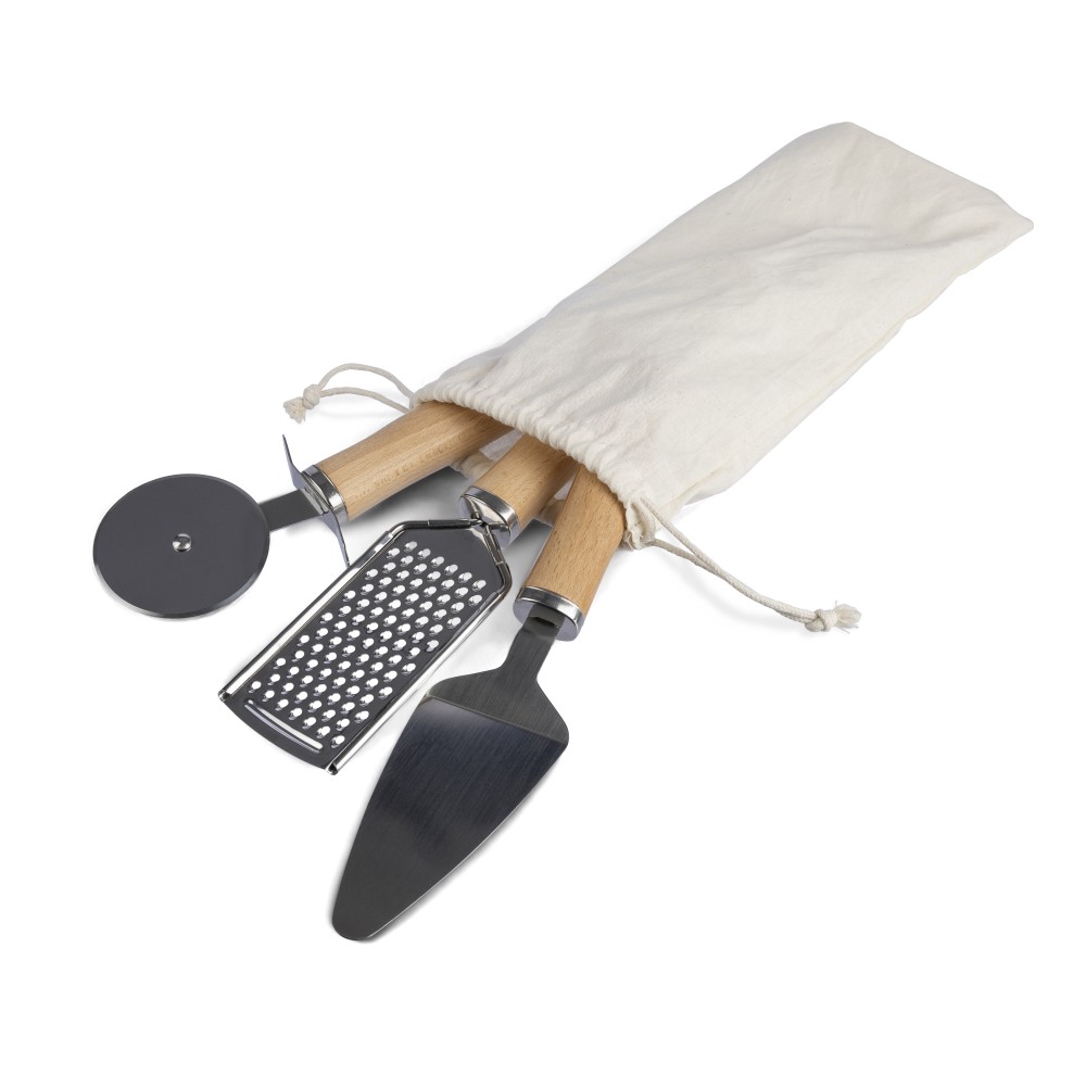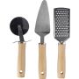 Fém és fa konyhai eszközkészlet vászontasakban. A készlet egy rozsdamentes acél reszelőt, tortalapátot és pizzavágót tartalmaz. Valamennyi eszköz fa nyéllel készült. Mosogatógépben nem tisztítható.