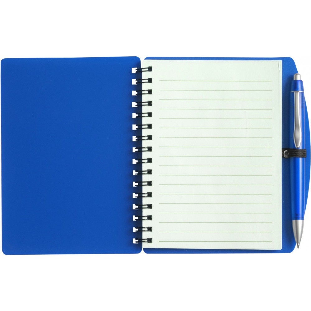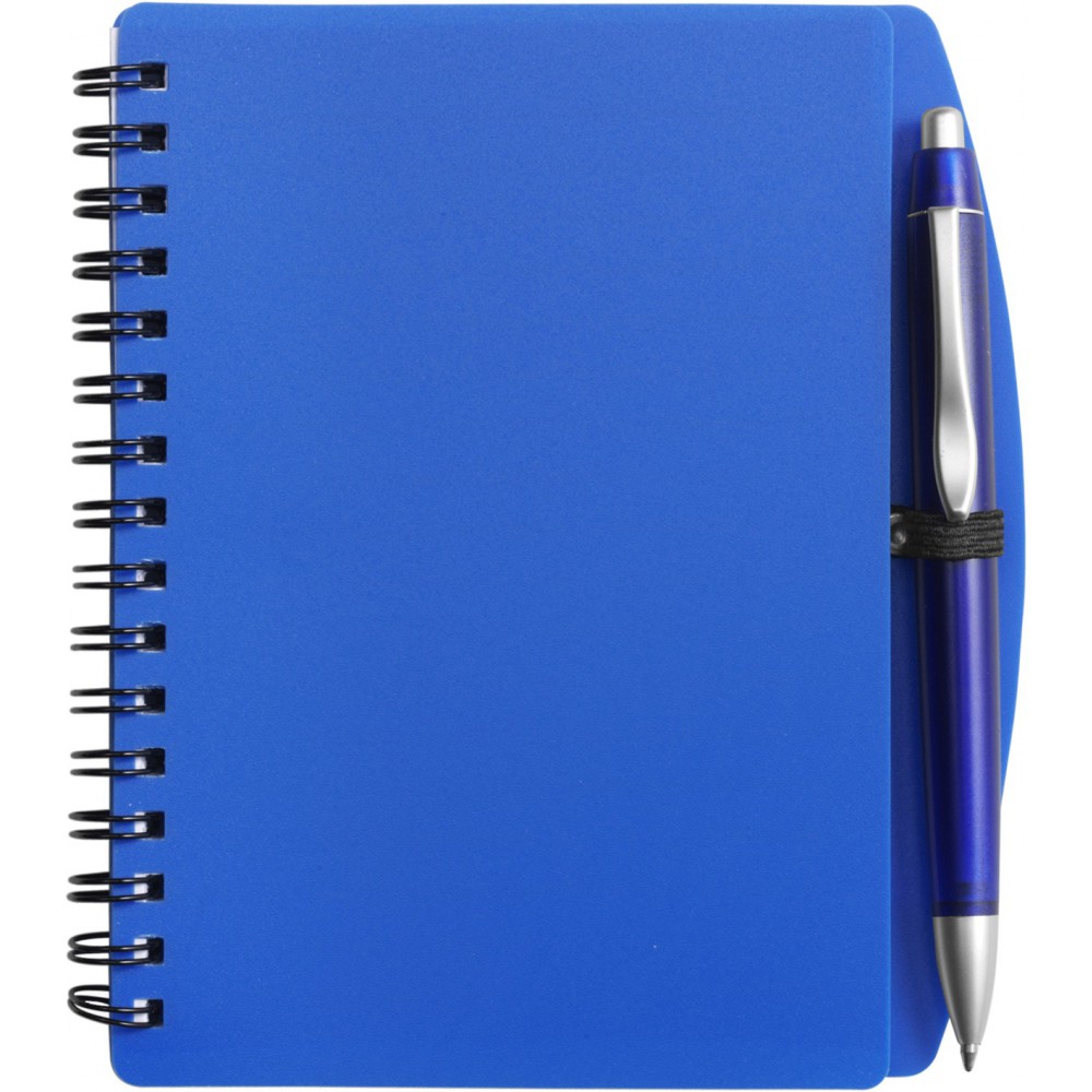 A6-os spirálfüzet PP borítóval, 65 lapos tömbbel, műanyag tollal, kék tollbetéttel.
