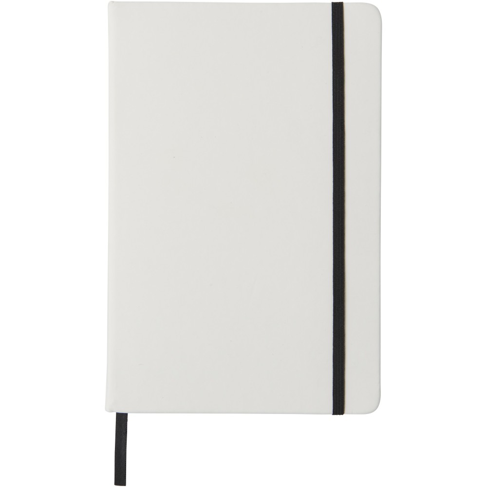 Fehér A5-ös füzet színes, gumis pánttal és könyvjelzővel, 96 db vonalas lappal.