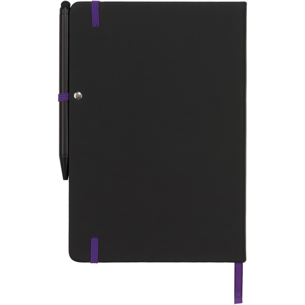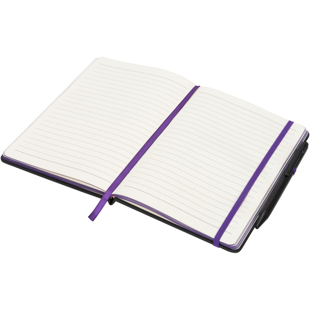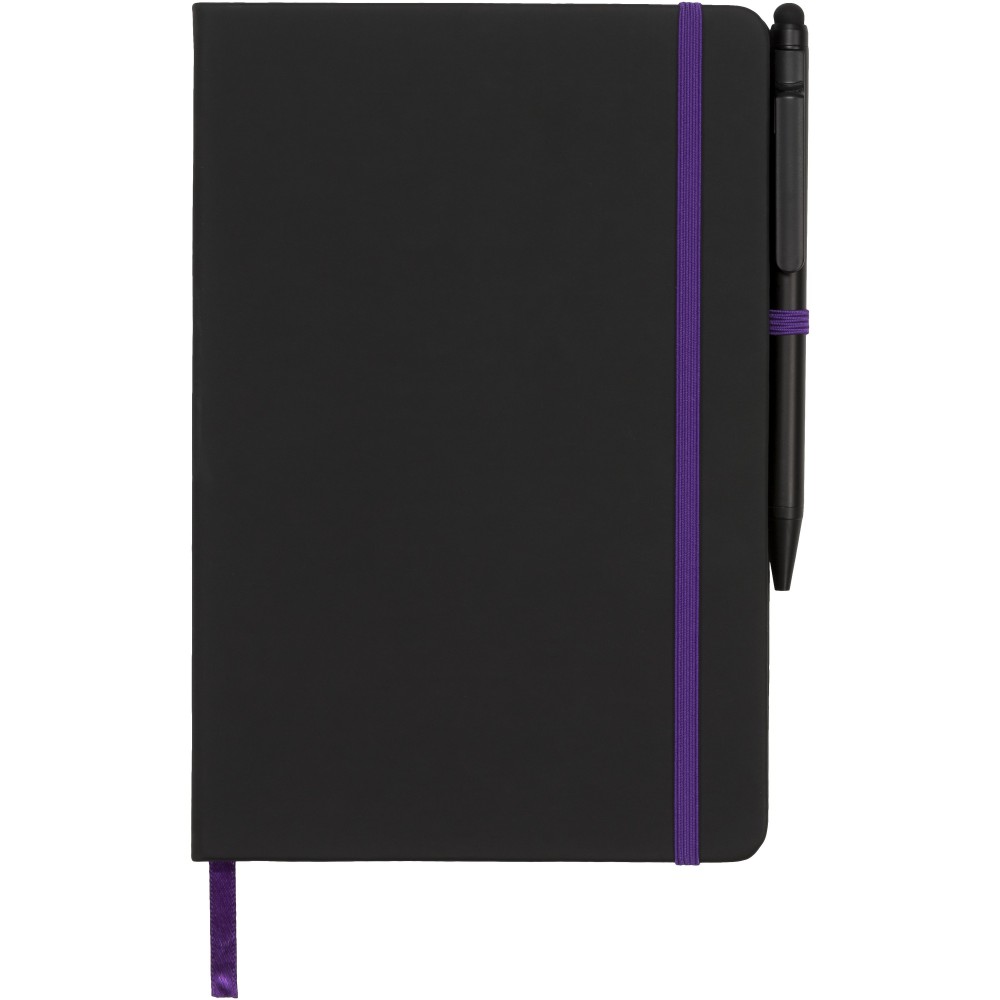 Puha felületű füzet színes lapélekkel, gumipánttal, könyvjelzővel és tullhurokkal és érintős golyóstollal. 96 krémszínű lapot tartalmaz.