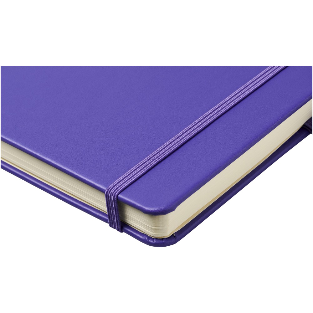 Műbőr A5-ös (14,2 cm x 21,4 cm) jegyzetfüzet gumiszalaggal, szalagjelölővel, tollhurokkal és harmonika hátsó zsebbel. 96 db vonalas krémszínű lapot tartalmaz (80 g/m2).