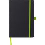 A5 füzet 96 vonalas lappal, könyvjelzővel, gumis zárópánttal. Lézergravírozás után a gravírozott felület színe megegyezik a gumipánt színével. PU anyag.