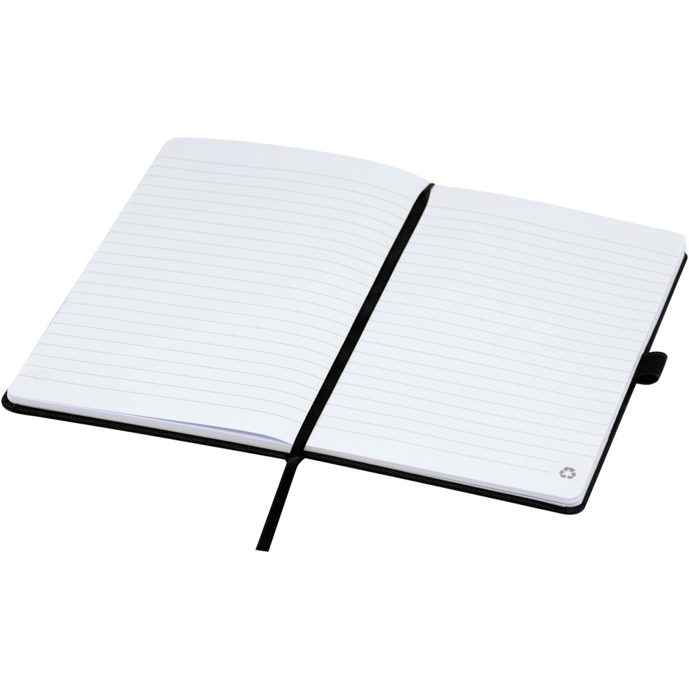 A5 jegyzetfüzet újrahasznosított PET műanyagból készült szövet borítóval. 80 lap 70 g/m2 újrahasznosított, vonalas papír, tolltartó hurok és szalag könyvjelző. Kombinálható a 107757 Honua RPET golyóstollal.