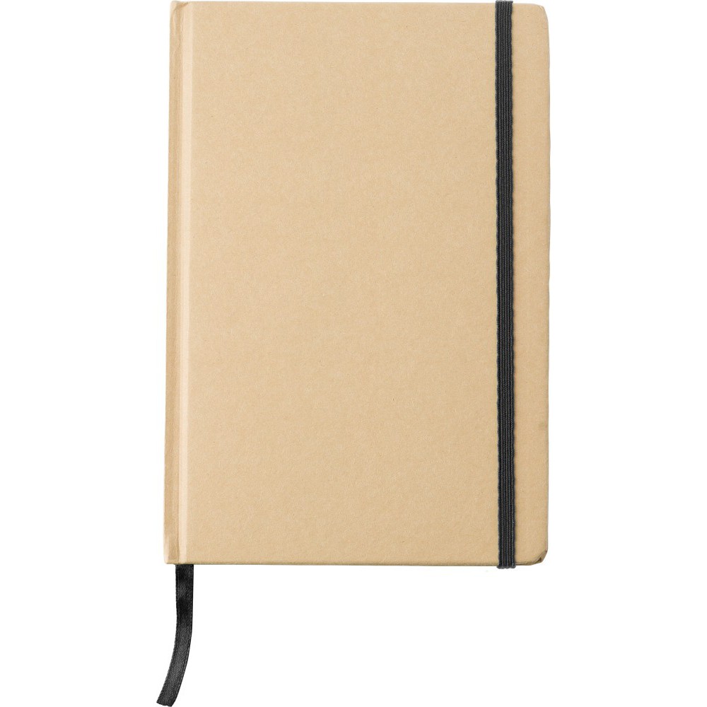 Újrahasznosított kartonból készült A5-ös jegyzetfüzet 80 vonalas lappal. Gumis záródás és könyvjelző szalag.