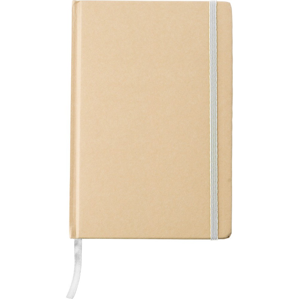 Újrahasznosított kartonból készült A5-ös jegyzetfüzet 80 vonalas lappal. Gumis záródás és könyvjelző szalag.