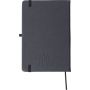 Újrahasznosított bőrből készült A5-ös jegyzetfüzet 100 vonalas lappal. Gumis záródás, tollhurok és könyvjelző szalag. Hátoldalán az újrahasznosított anyagra utaló logónyomat látható.