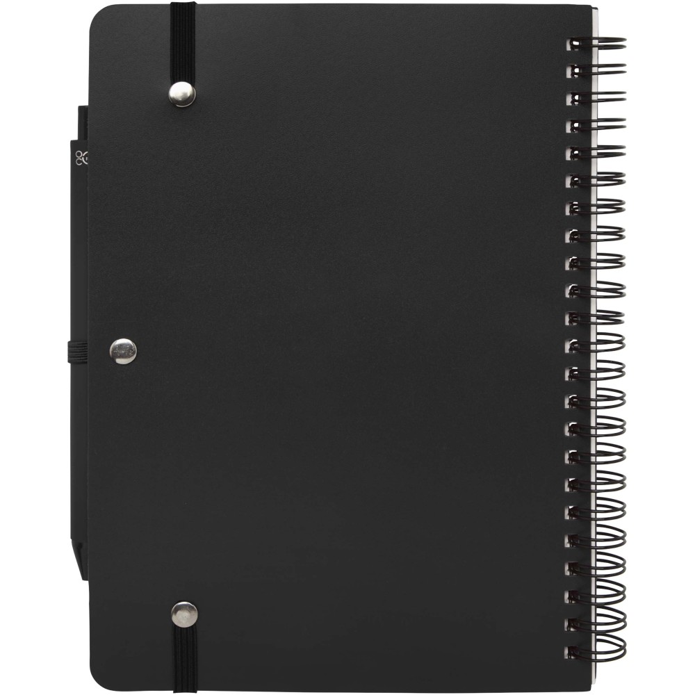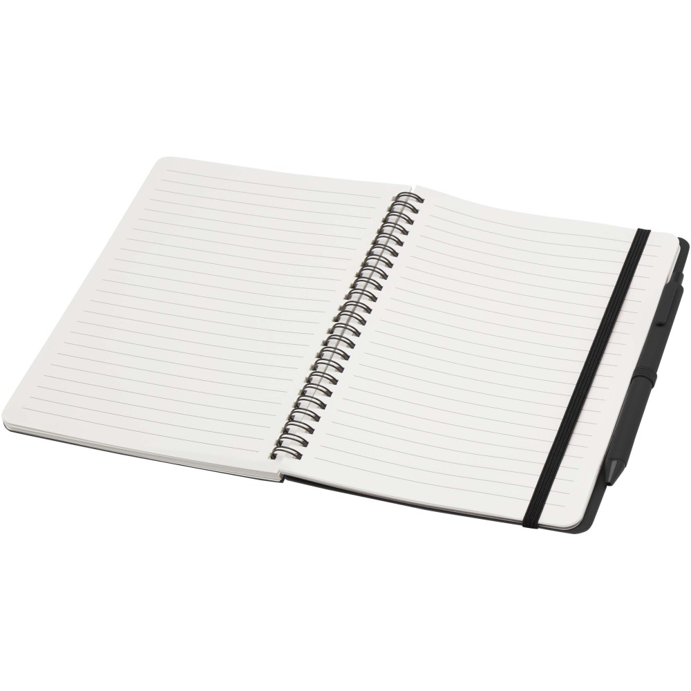 Thalaasa A5 keményfedeles jegyzetfüzet óceánból származó újrahasznosított műanyagból készült, és 80 vonalas, 70 g/m2 krémszínű lapot tartalmaz. A jegyzetfüzet lekerekített sarkokkal, elasztikus zárással és tolltartóval rendelkezik. A fekete tintával író golyóstoll szintén óceánból származó újrahasznosított műanyagból készült. Íráshossz: 1000 méter. Tollhegy mérete: 1,0 mm.