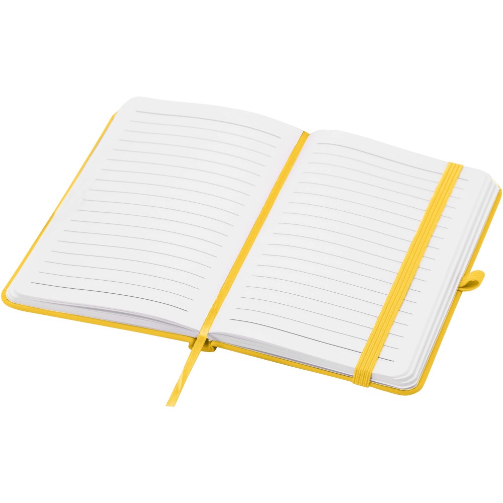 A Spectrum Plus A6 keményfedeles jegyzetfüzet lekerekített sarkokkal nemcsak az irodai mindennapok elengedhetetlen kelléke, hanem remek lehetőség márkád népszerűsítésére is. A jegyzetfüzet puha tapintású borítóval rendelkezik és 80 vonalas, krémszínű, 70 g/m2-es lapból áll, amely tökéletes gyors ötletek vagy hosszabb jegyzetek rögzítésére. A jegyzetfüzet tolltartó hurokkal, gumiszalagos záródással, könyvjelzővel és harmonikazsebbel van ellátva.