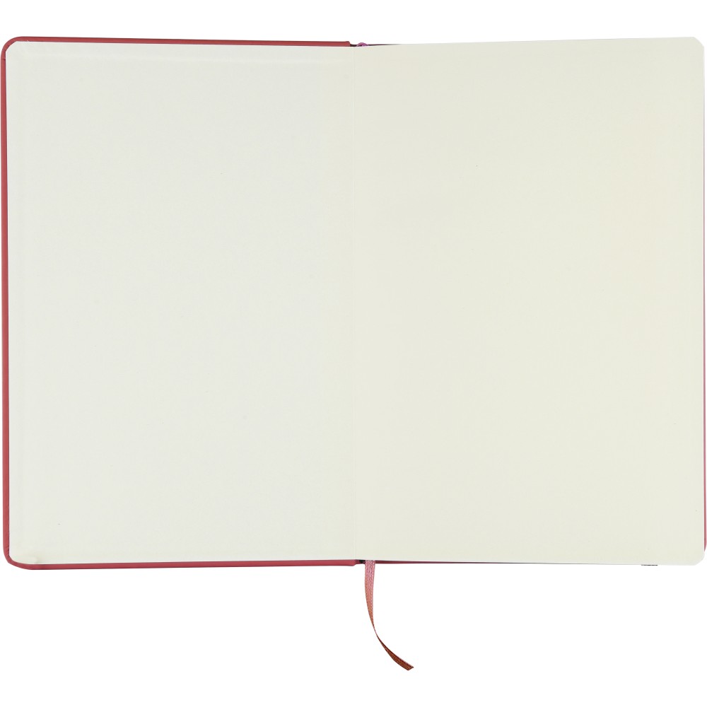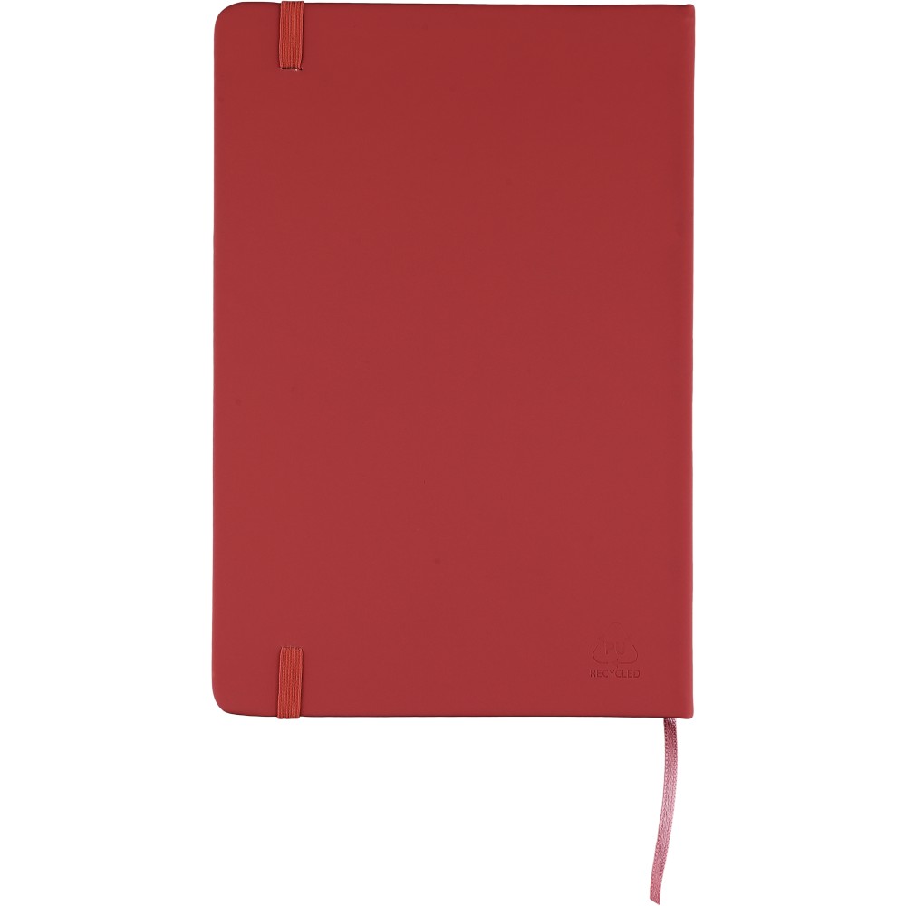 A5-ös méretű jegyzetfüzet rPET PU anyagból készült kemény borítóval, 80 vonalas lappal (70g/m2), színben illeszkedő gumipánttal és könyvjelző szalaggal. Az újrahasznosított anyagra utaló dombornyomott logóval a füzet hátoldalán.