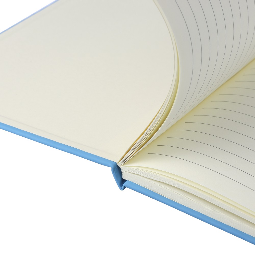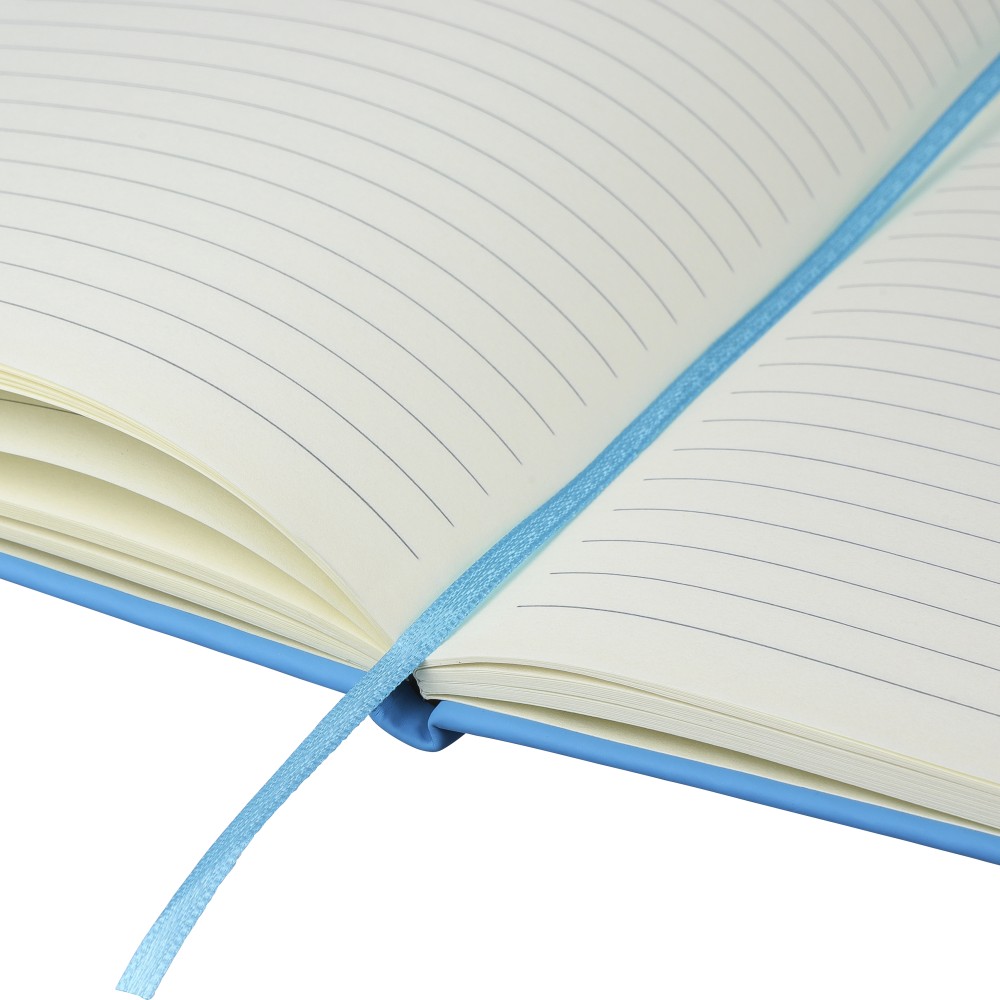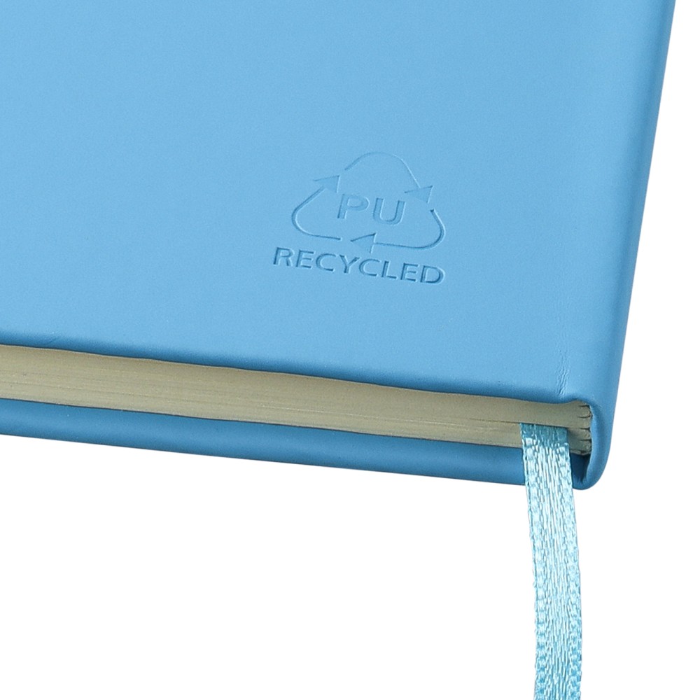 A5-ös méretű jegyzetfüzet rPET PU anyagból készült kemény borítóval, 80 vonalas lappal (70g/m2), színben illeszkedő gumipánttal és könyvjelző szalaggal. Az újrahasznosított anyagra utaló dombornyomott logóval a füzet hátoldalán.