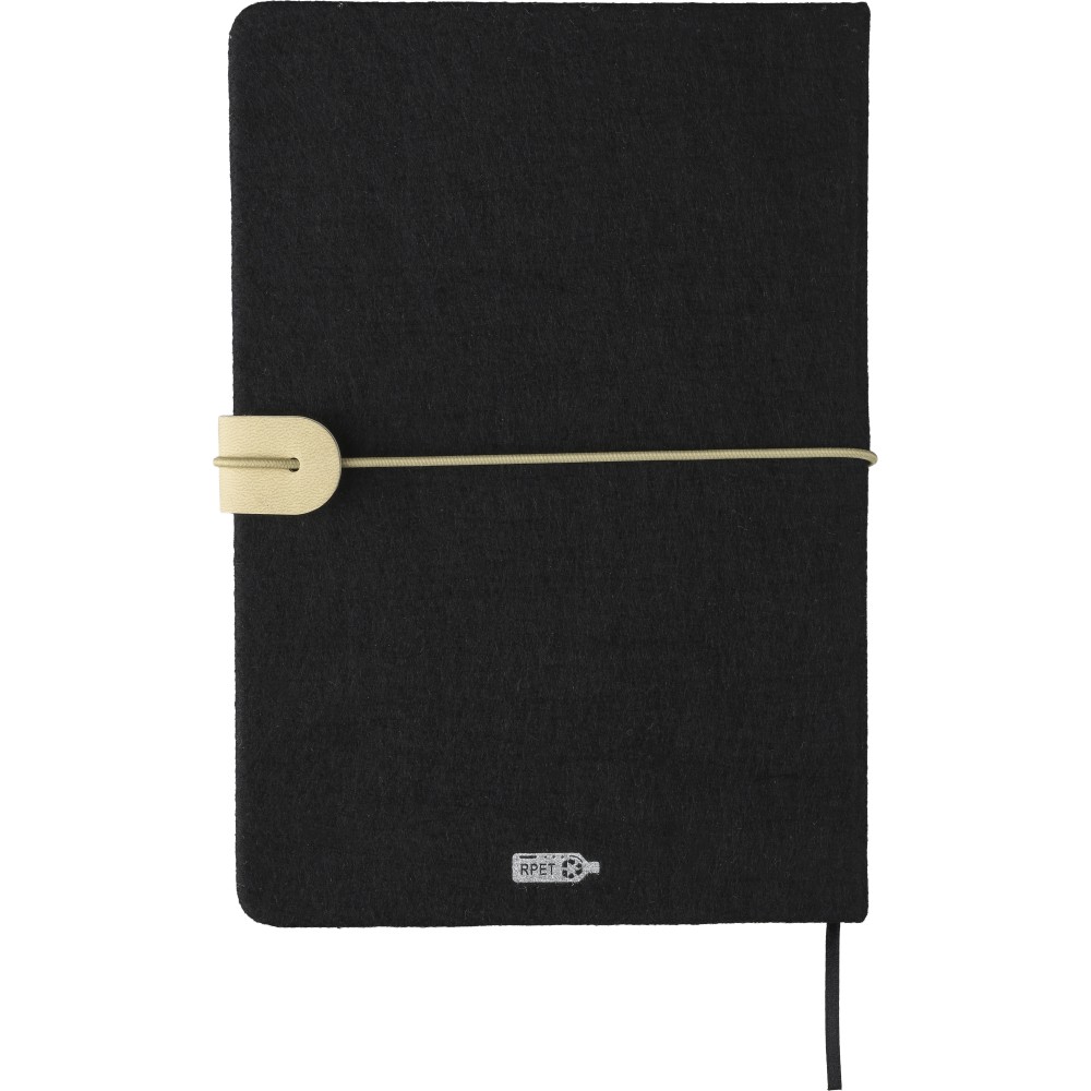 Újrahasznosított filcből készült jegyzetfüzet, kb. A5-ös méretű, 80 lapos. Puha tapintású kemény borítóval, gumiszalaggal és kívül PU zárópánttal. Szalagos könyvjelzővel és 70 g/m2-es vonalas papírral. A hátoldalán lézergravírozott újrahasznosított logóval.