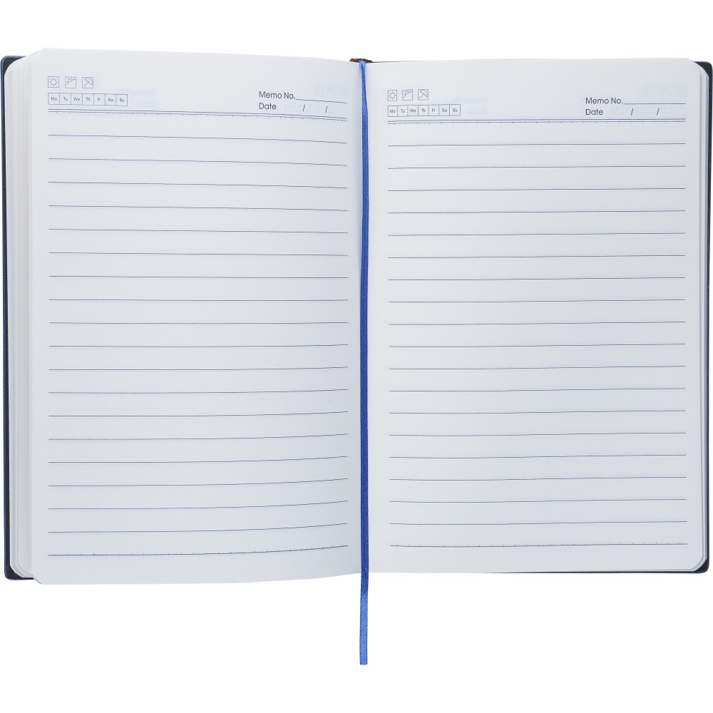 Újrahasznosított PU jegyzetfüzet, kb. A5-ös méretű, 100 lapos. Kemény borítóval és kordbársony hatású bevonattal az elülső és a hátlap felső részén. Tartalmaz egy szalagos könyvjelzőt és 80 g/m2-es vonalas lapokat. A hátoldalon dombornyomott újrahasznosított logóval.